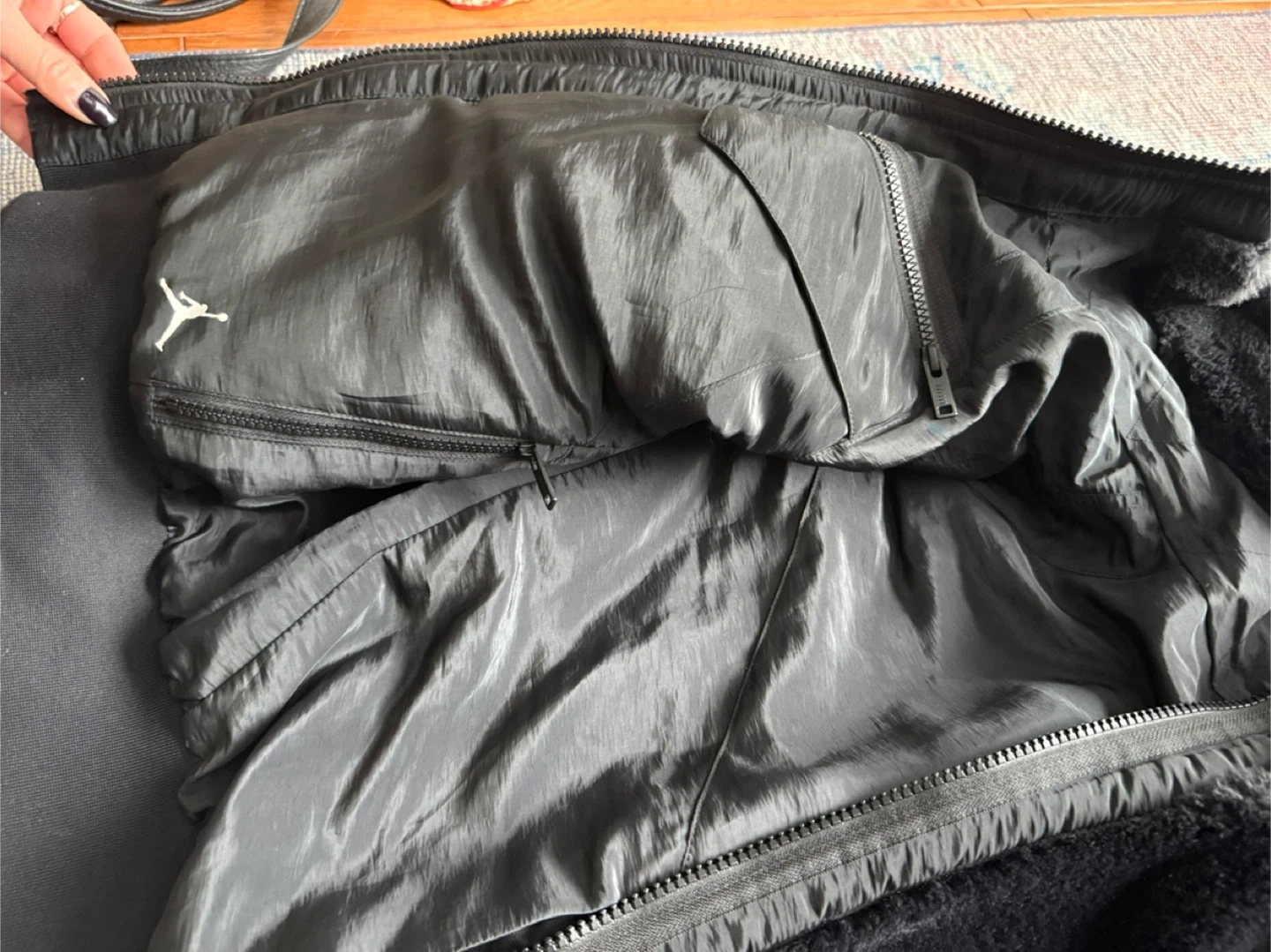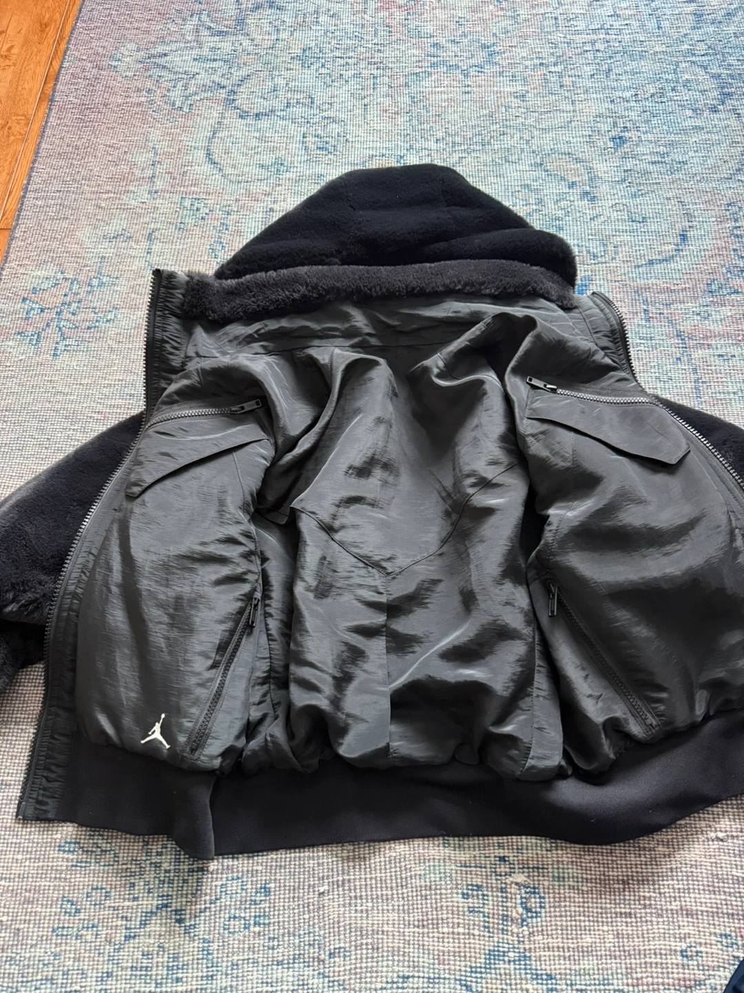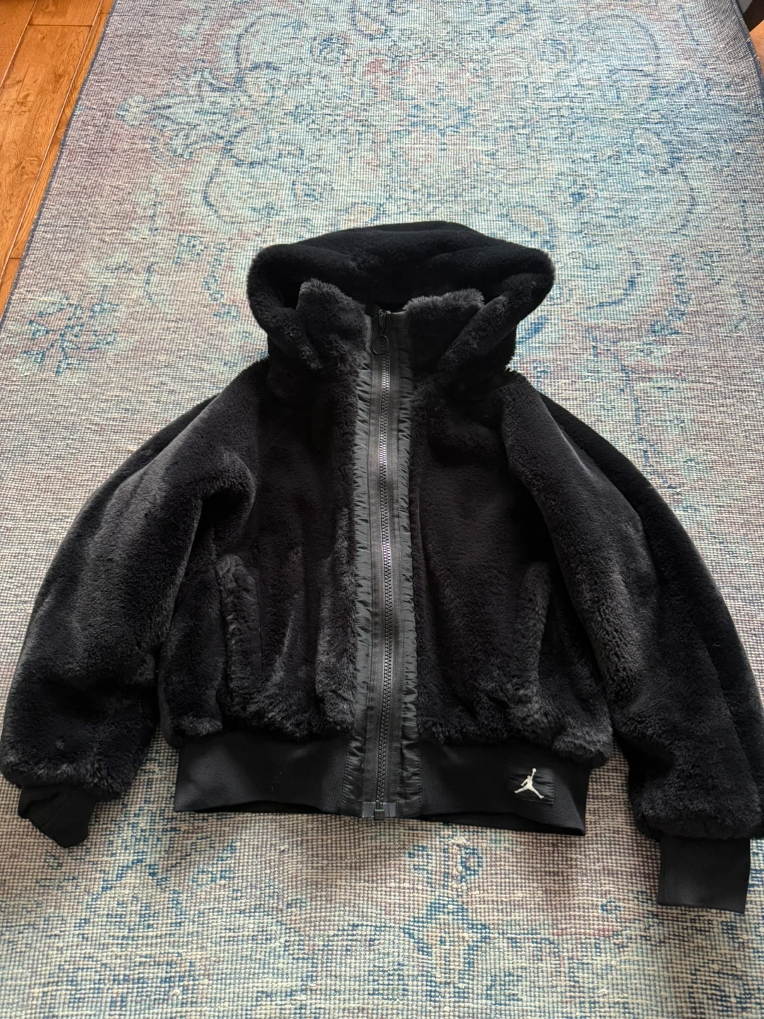Selling a Reversible Jordan faux fur jacket in black. It's super cozy and stylish for the colder weather. The jacket features a hood and the iconic Jordan logo. Perfect for adding a touch of sporty chic to your wardrobe!