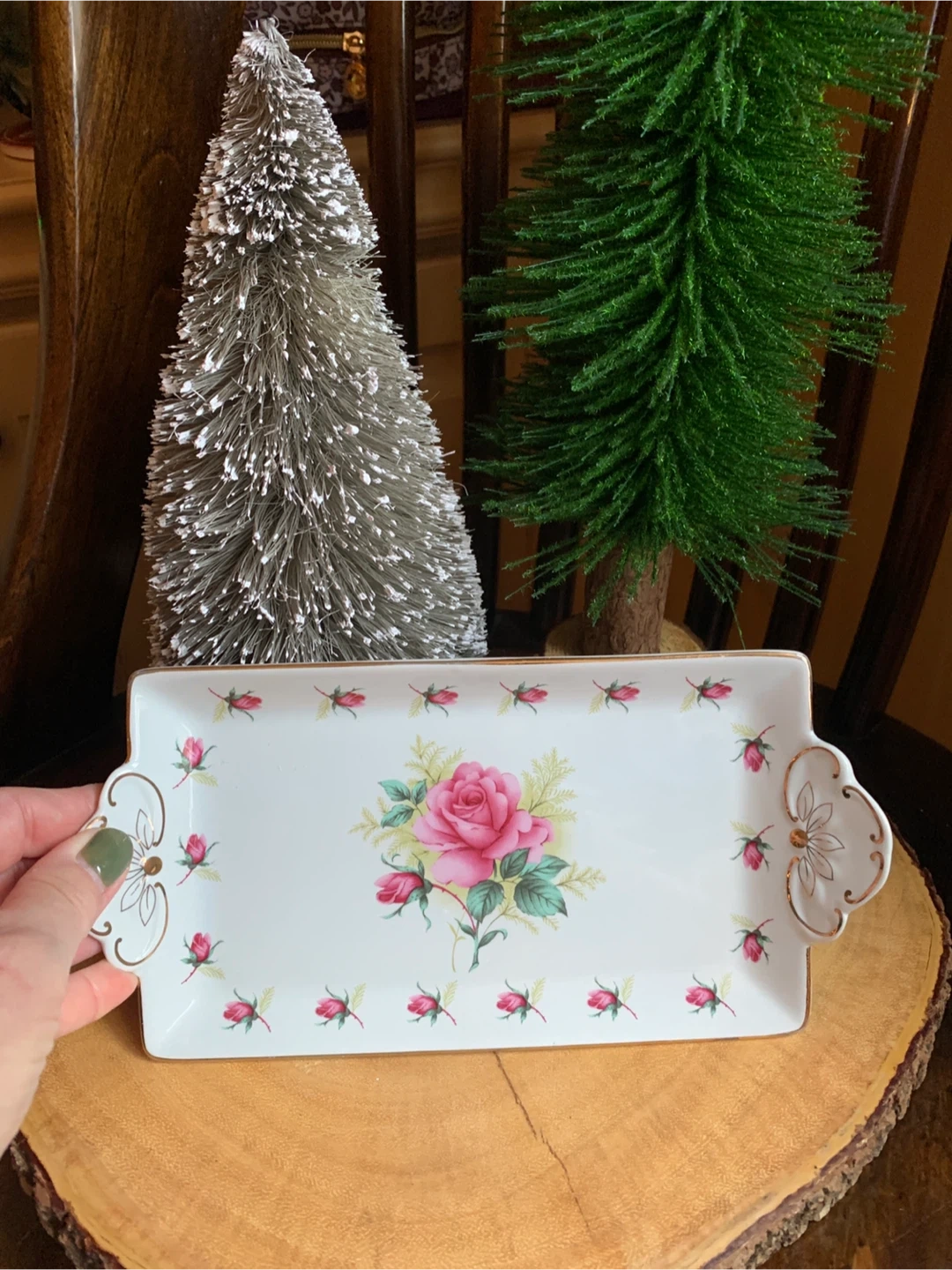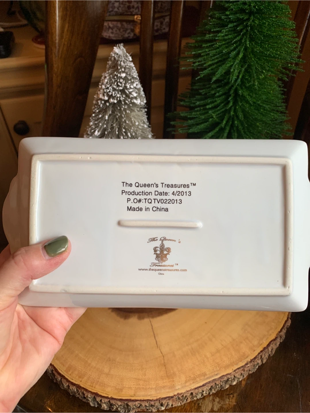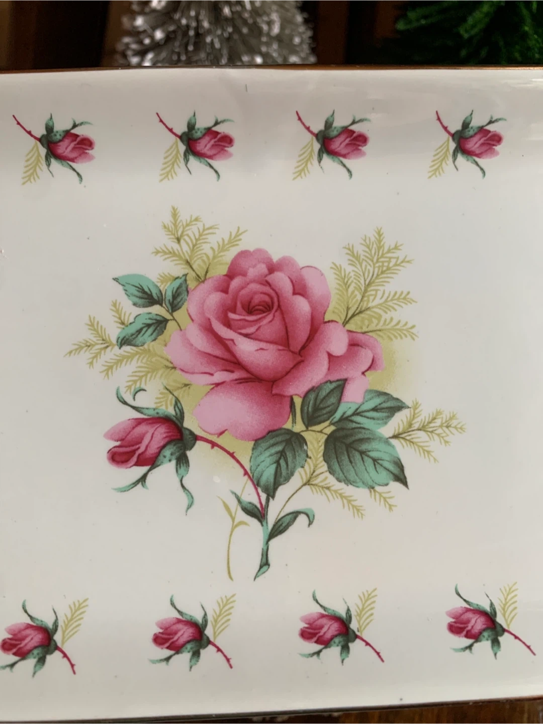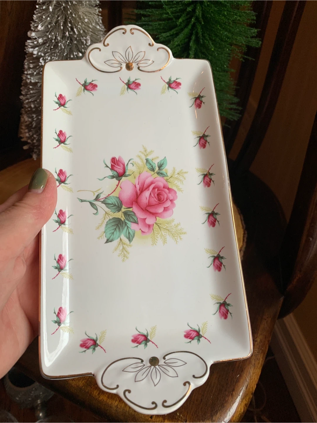 Selling a lovely vintage tray from The Queen's Treasures from 2013! It features a beautiful rose design in pink and green. It has no chips or crazing. It would make a beautiful trinket tray for jewelry on a dresser or nightstand. The pink roses make a lovely backdrop for a gift of jewelry for that someone special or to gift to yourself! 💕🩷