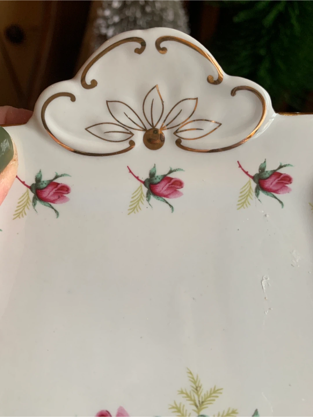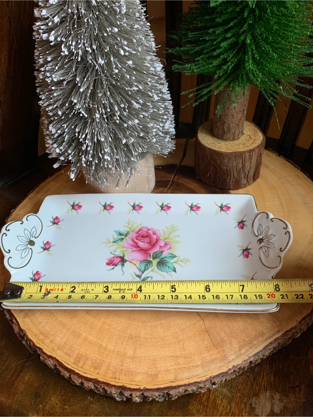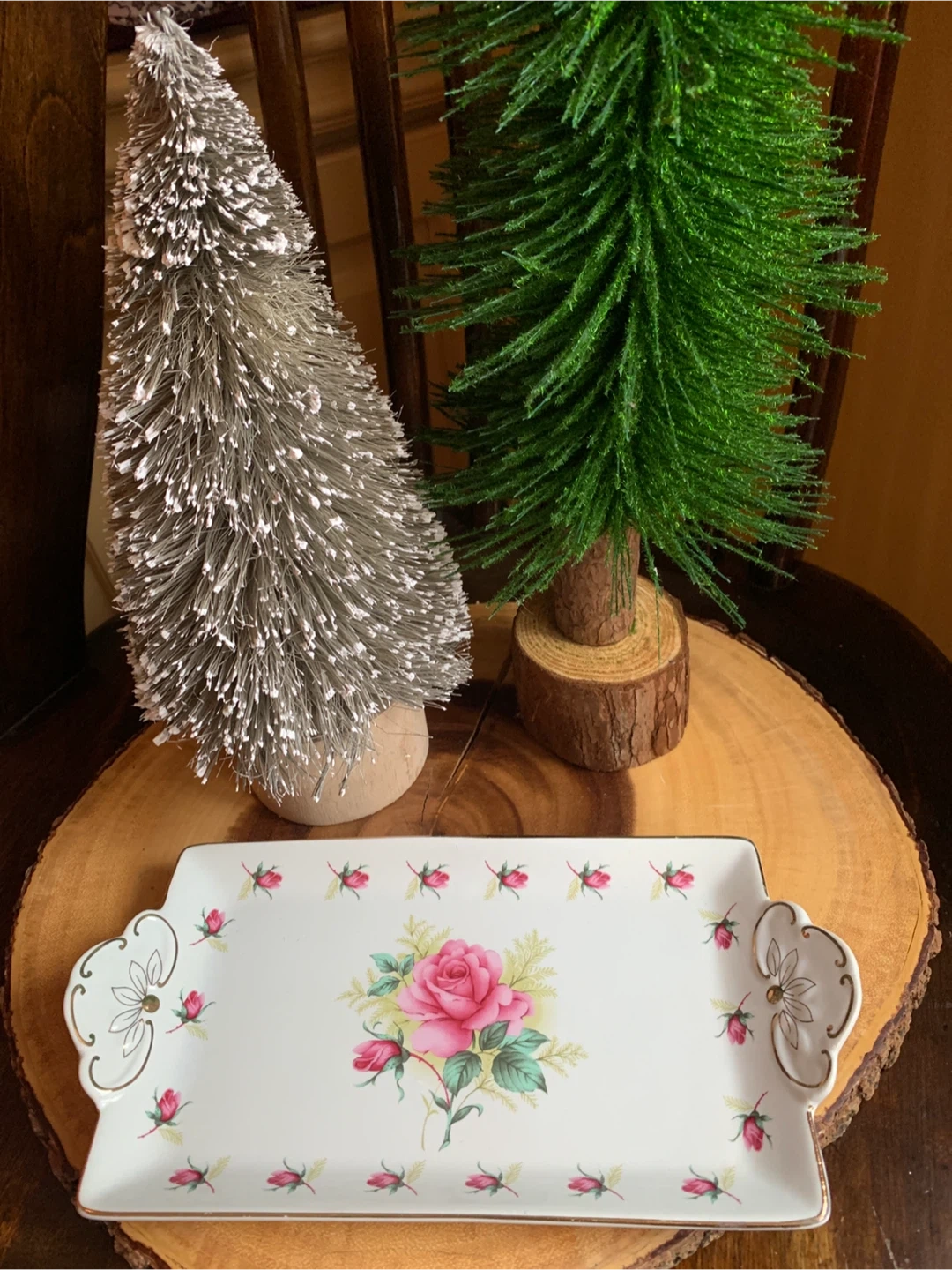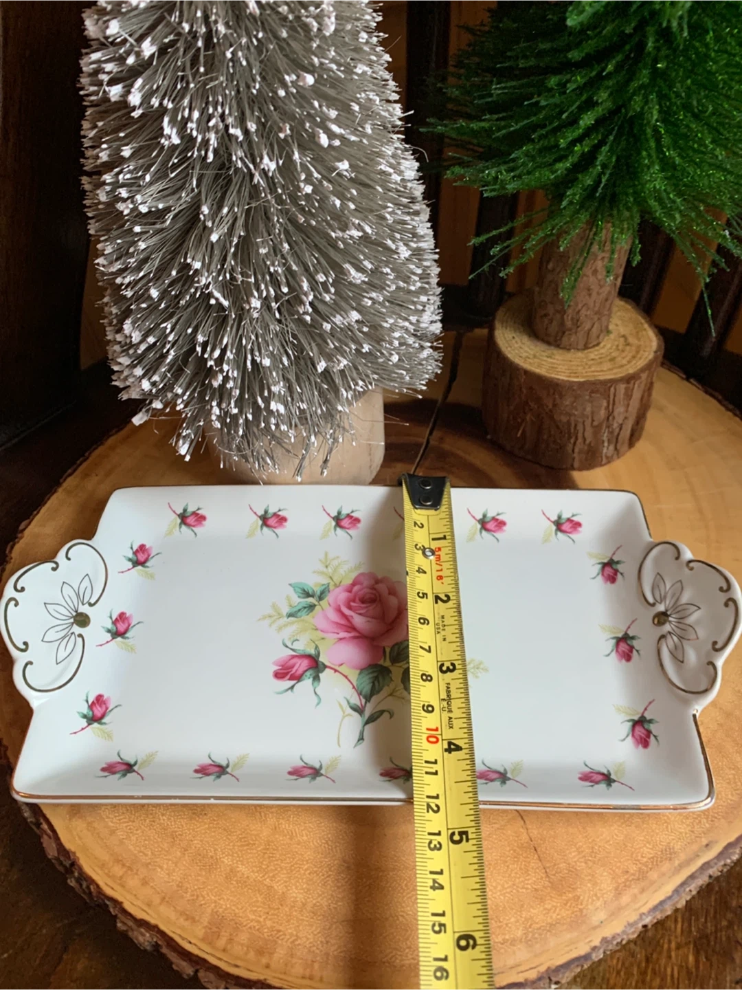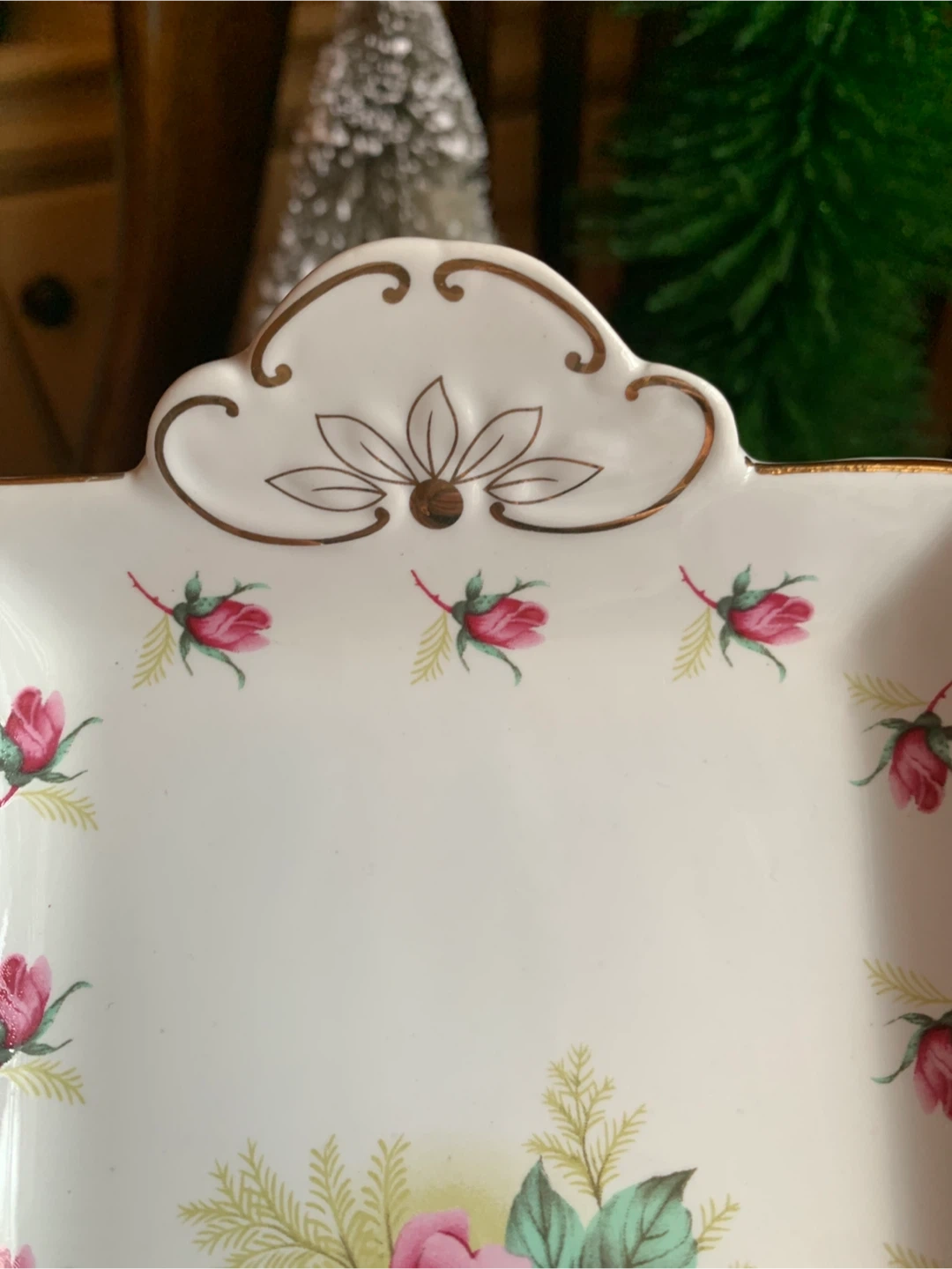 Selling a lovely vintage tray from The Queen's Treasures from 2013! It features a beautiful rose design in pink and green. It has no chips or crazing. It would make a beautiful trinket tray for jewelry on a dresser or nightstand. The pink roses make a lovely backdrop for a gift of jewelry for that someone special or to gift to yourself! 💕🩷