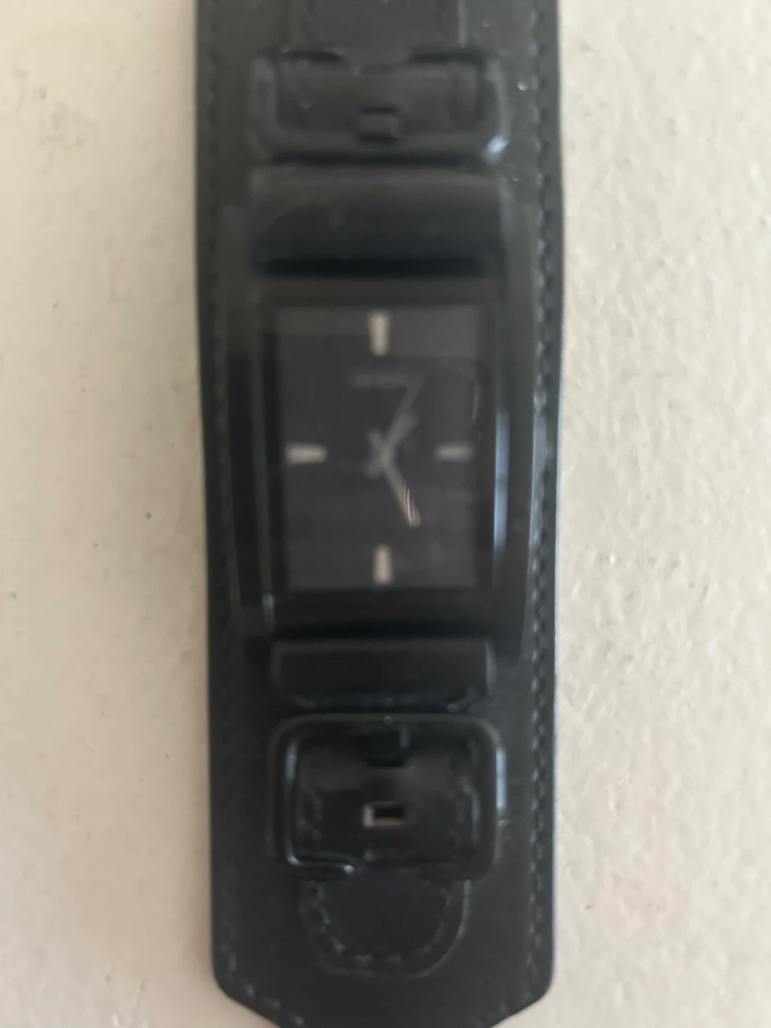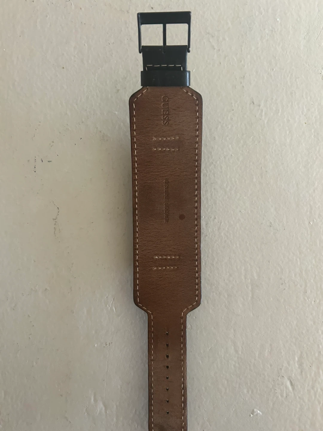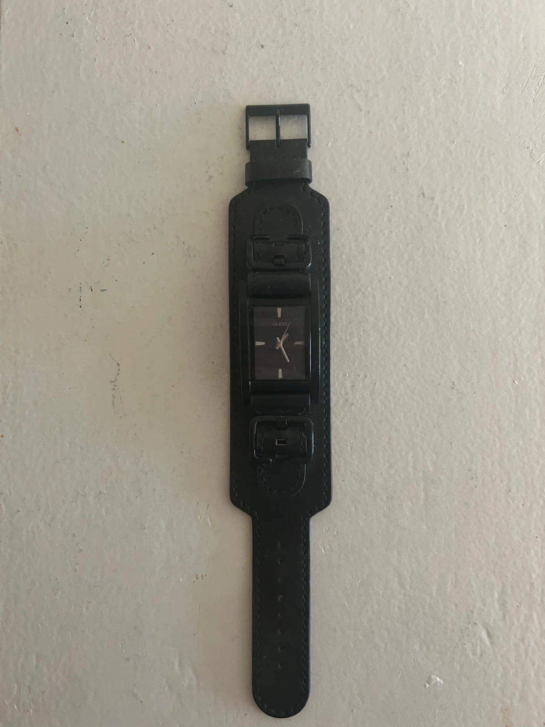 Selling a Guess black leather cuff watch. It's in good condition and has a unique style. The band is genuine leather and the watch face is a sleek black colour