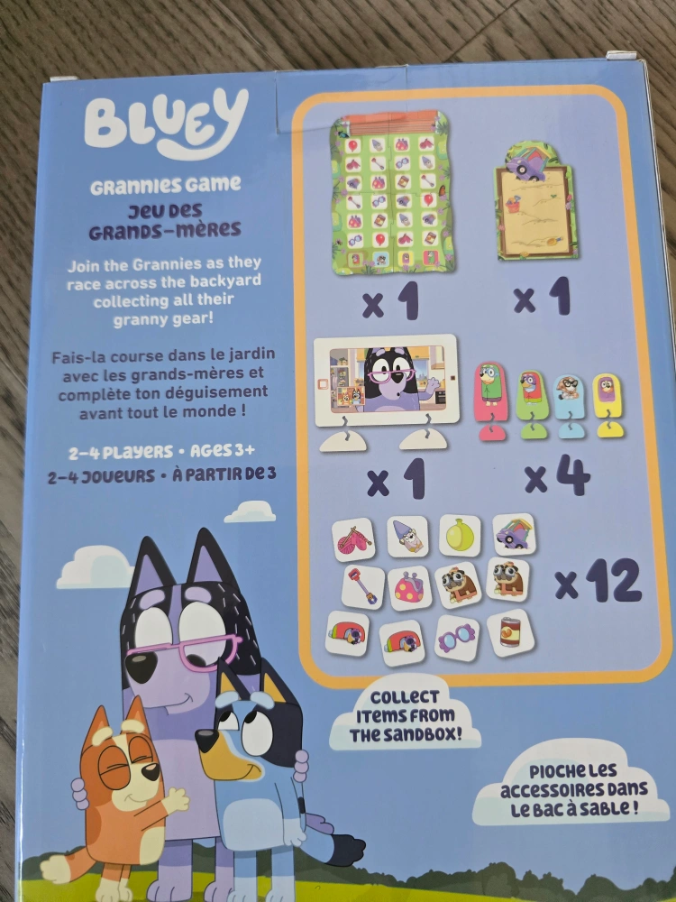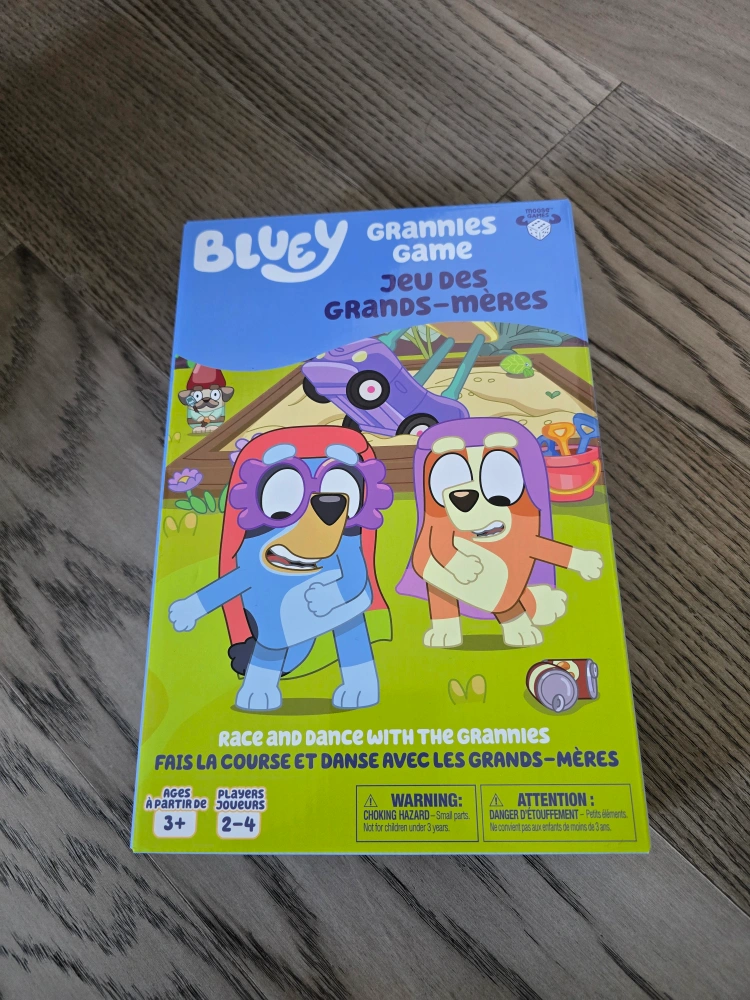 Selling a Brand New Bluey Grannies Game (Jeu des Grands-Mères)! It's a fun game where you race and dance with the grannies. Perfect for 2-4 players, ages 3+