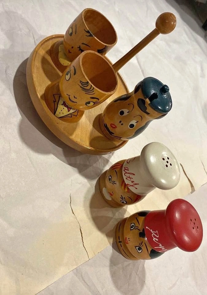 A charming set of vintage 1950s Mid Century Modern wooden salt and pepper shakers with a matching caddy. Perfect for adding a retro touch to your kitchen or dining table.