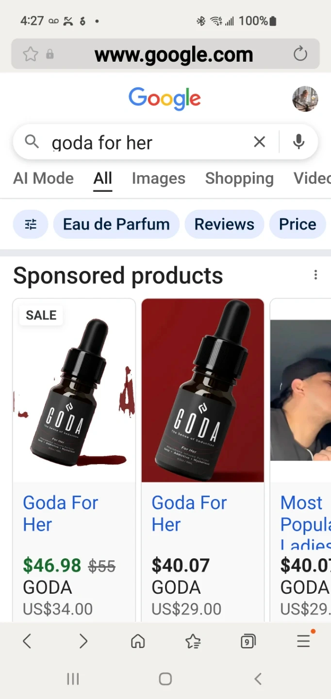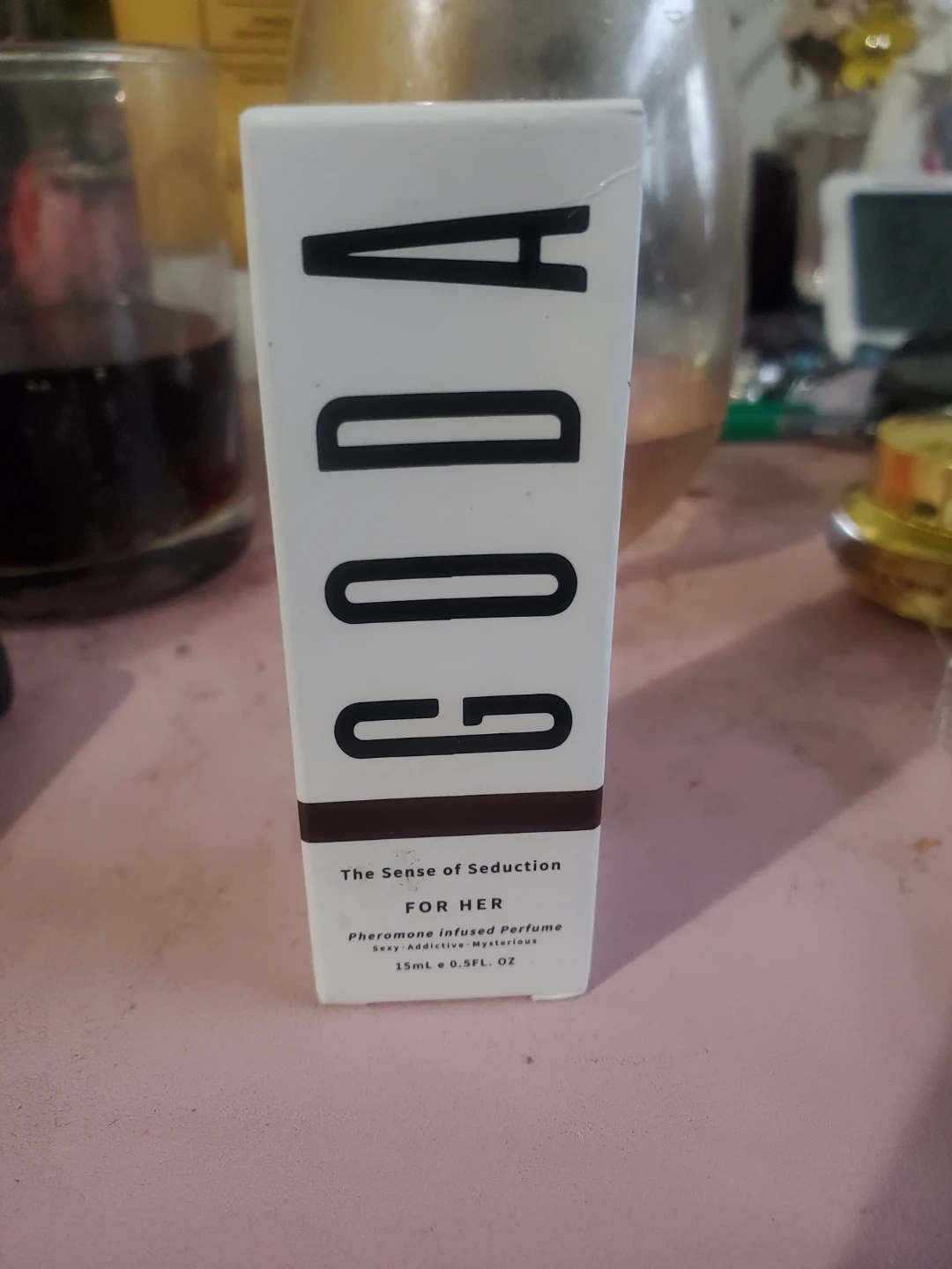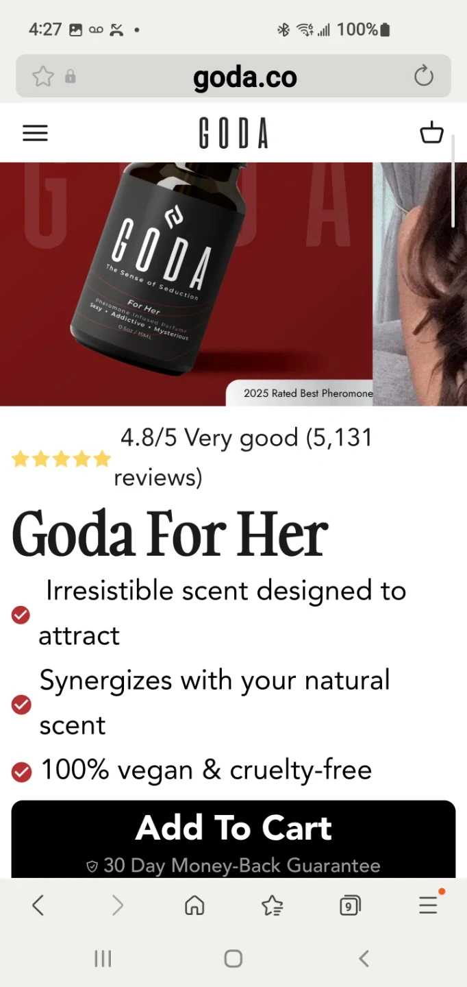 Selling a bottle of Goda For Her, the sense of seduction pheromone-infused perfume. It's designed to attract and synergizes with your natural scent. It is also 100% vegan & cruelty-free. The bottle contains 15ml/0.5FL.OZ.