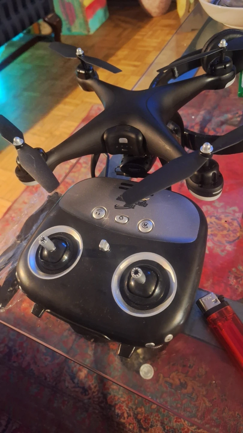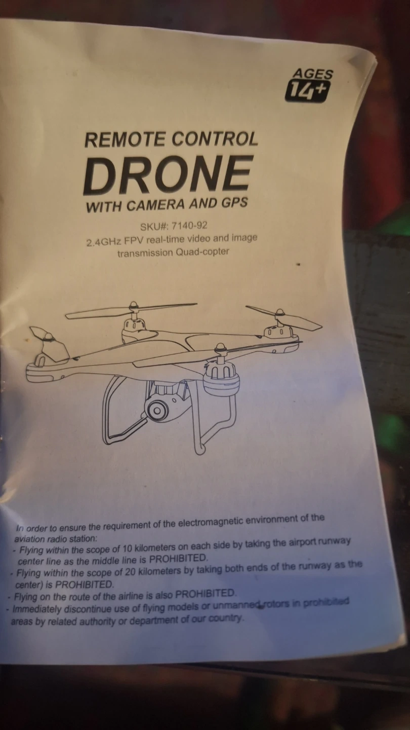 Selling a remote control drone with camera and GPS. Includes the drone itself, the remote control, and a bag of accessories. Recommended for ages 14+
