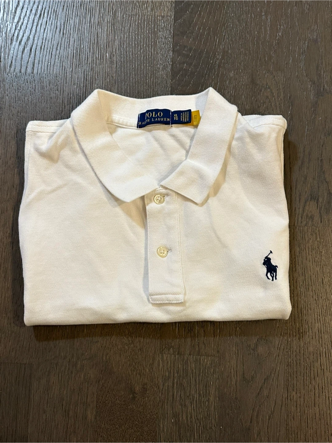 Selling a classic white Ralph Lauren polo shirt in size XL. It's in great condition and ready for a new home! The iconic polo player logo is embroidered on the chest. Perfect for a casual or dressed-up look