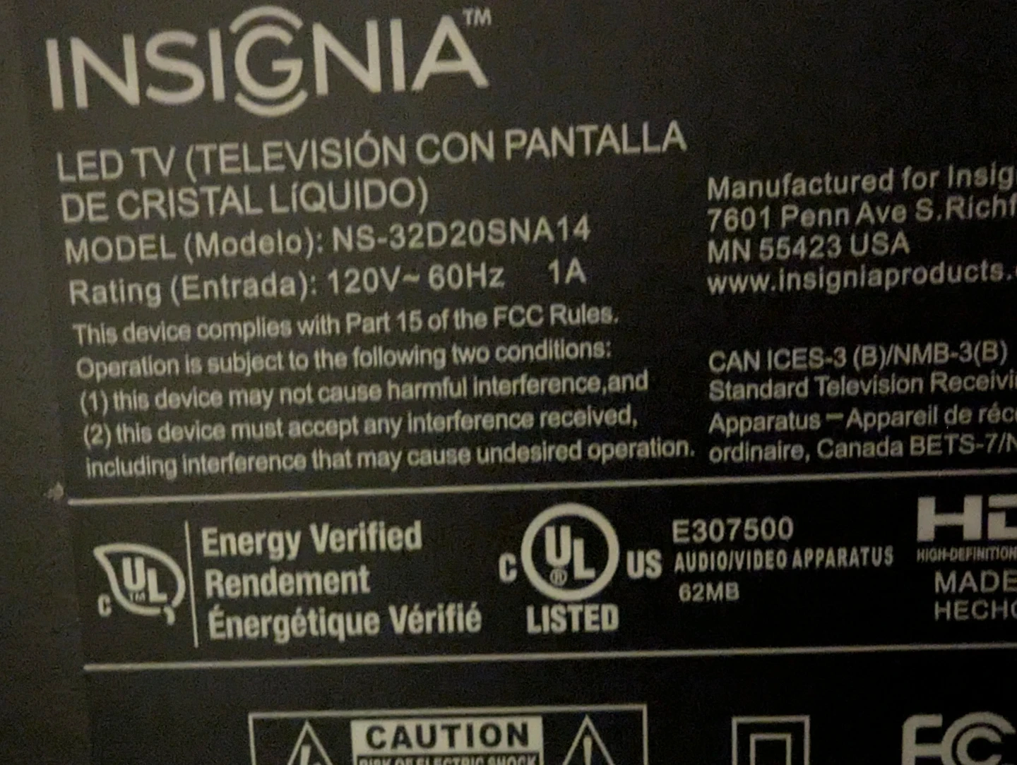 Insignia NS-32D20SNA14 32-inch LED TV with remote control (no batteries and no box).