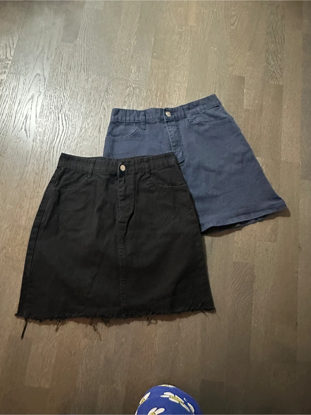 Selling two denim skirts, one from Fresh More Ain (size L) and the other from Poly.U (size M). The Fresh More Ain skirt is a dark blue denim, while the Poly.U skirt is black. Both are in great condition and ready for a new home!