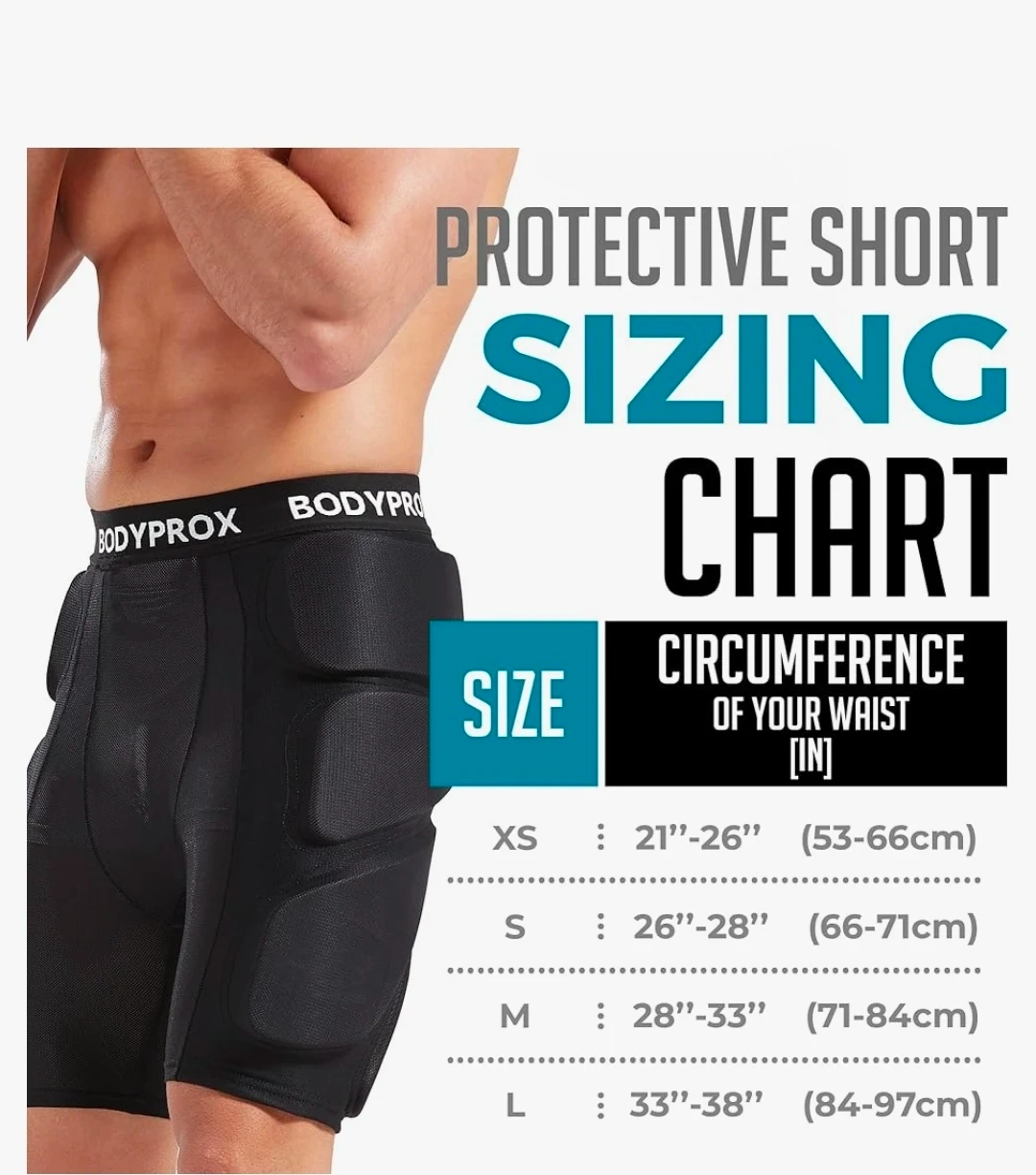 Selling a pair of Bodyprox protective shorts in size Small. These are great for providing extra padding and protection during sports or other activities. Please refer to the sizing chart in the pictures to ensure the right fit!