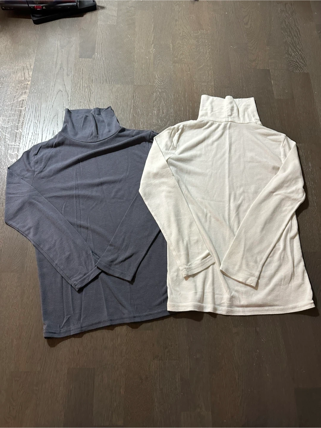 Here are two long-sleeve turtleneck shirts! One is a darker gray/blue color, and the other is a light beige color. They are in good condition and ready for a new home