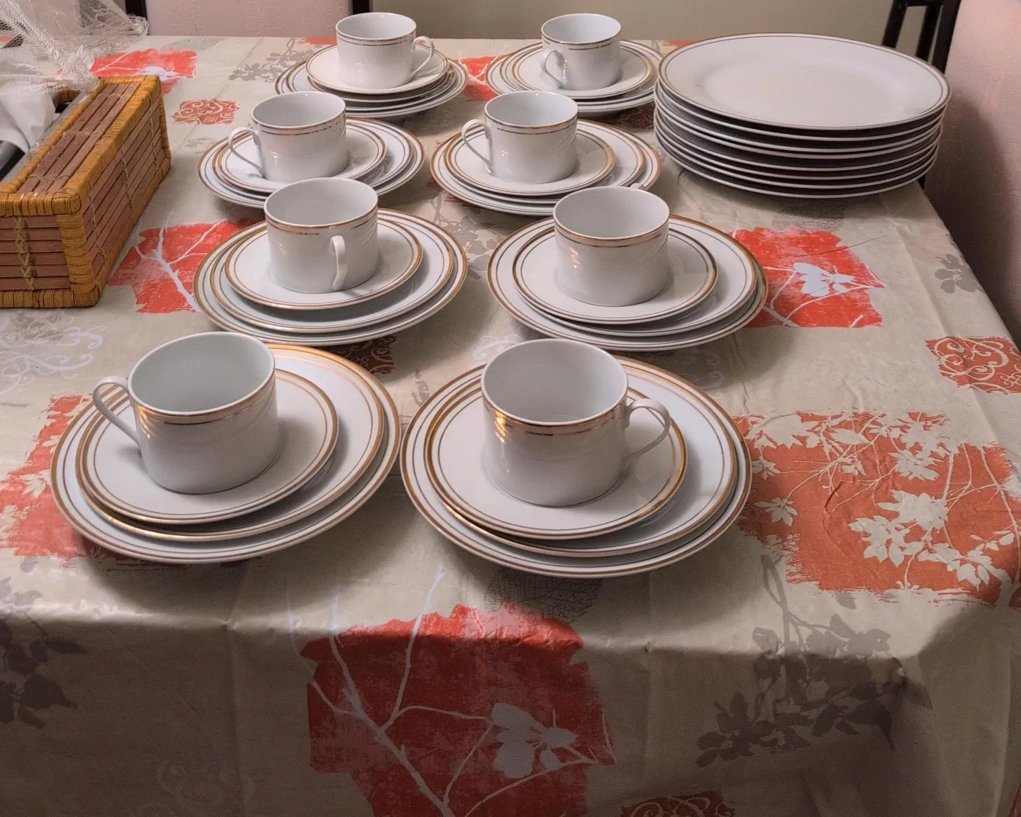 Selling a beautiful dinnerware set! Includes plates, saucers, and cups, all in a classic white with elegant gold trim. Perfect for adding a touch of sophistication to your dining experience no box bring the box please