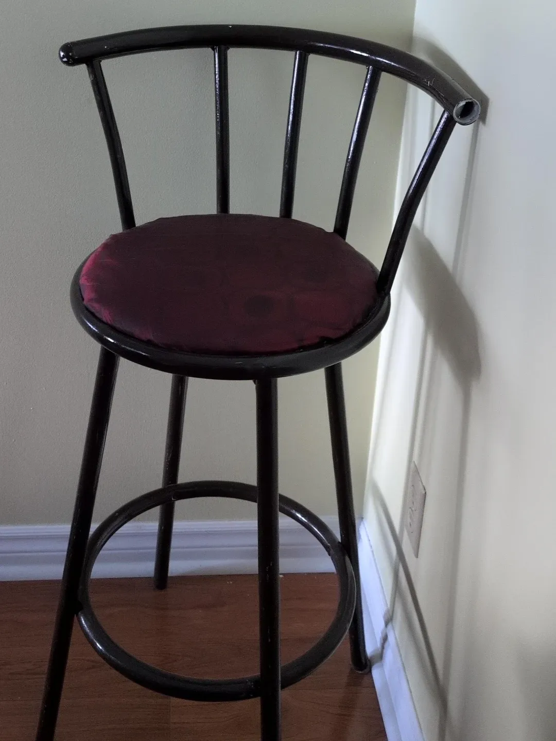 Selling a bar stool with a sleek black frame and a comfortable maroon cushion. It's in great shape and would be a stylish addition to any kitchen or bar area
