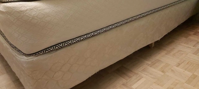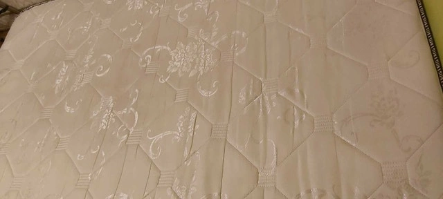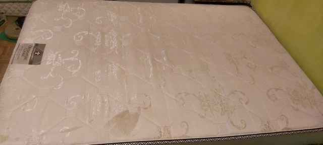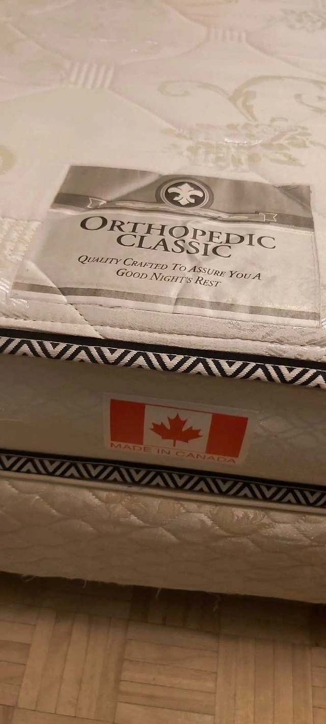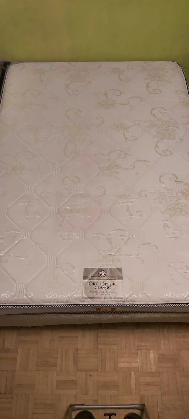 Good condition full/double size mattress by Orthopedic Classic. Canadian made. Used lightly and in solid shape, more on the firm side. One spot of damage to the weave toward the bottom right corner. Bedskirt also available, and possibly some sheets. Cash accepted.