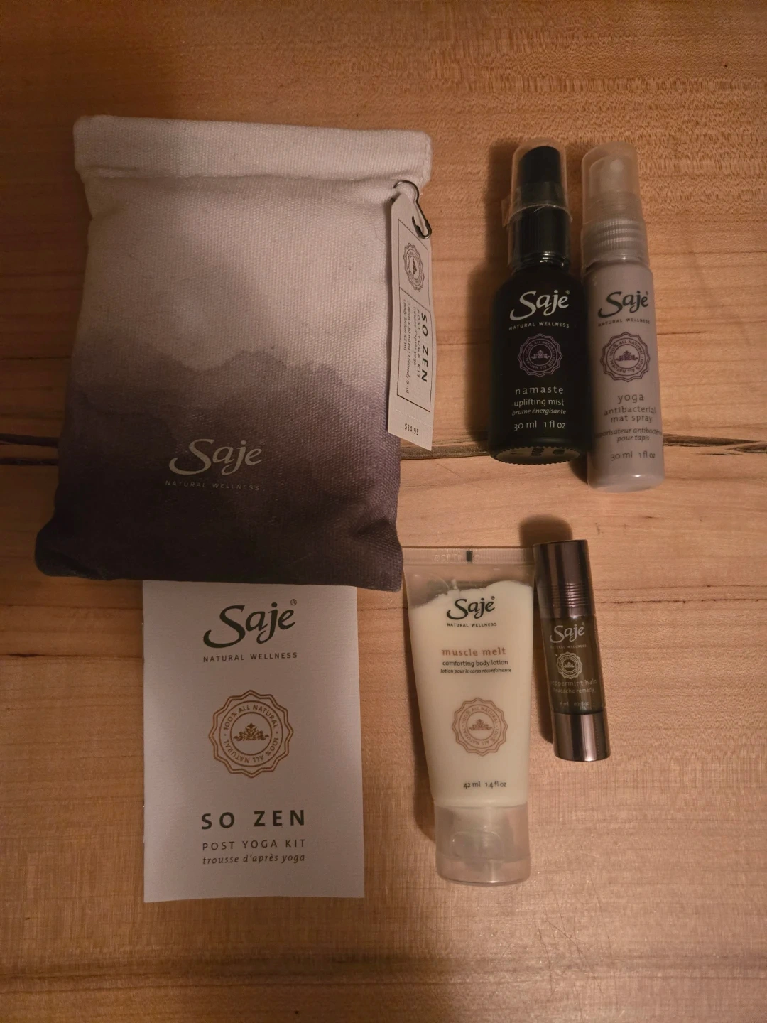 Selling a Saje So Zen Post Yoga Kit! It includes a Namaste Uplifting Mist (30 ml), Yoga Antibacterial Mat Spray (30 ml), Muscle Melt Comforting Body Lotion (42 ml), and a remedy. The kit comes in a cute bag. Originally $34.95!