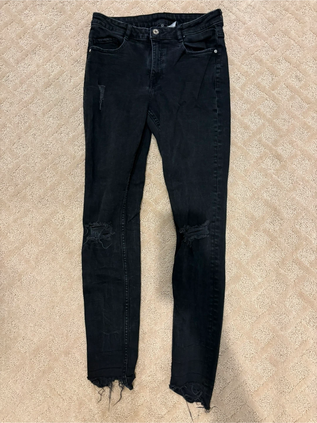 Selling a pair of H&M Divided black distressed jeans in size 10! These jeans feature a stylish, worn look with distressed detailing. Perfect for adding a bit of edge to your wardrobe!