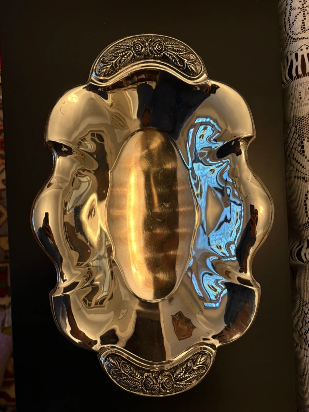 Selling a lovely vintage silver plated serving dish! It has a unique floral design around the edges. Perfect for adding a touch of elegance to your table or as a decorative piece. It’s 11.5” long and 7” wide.
