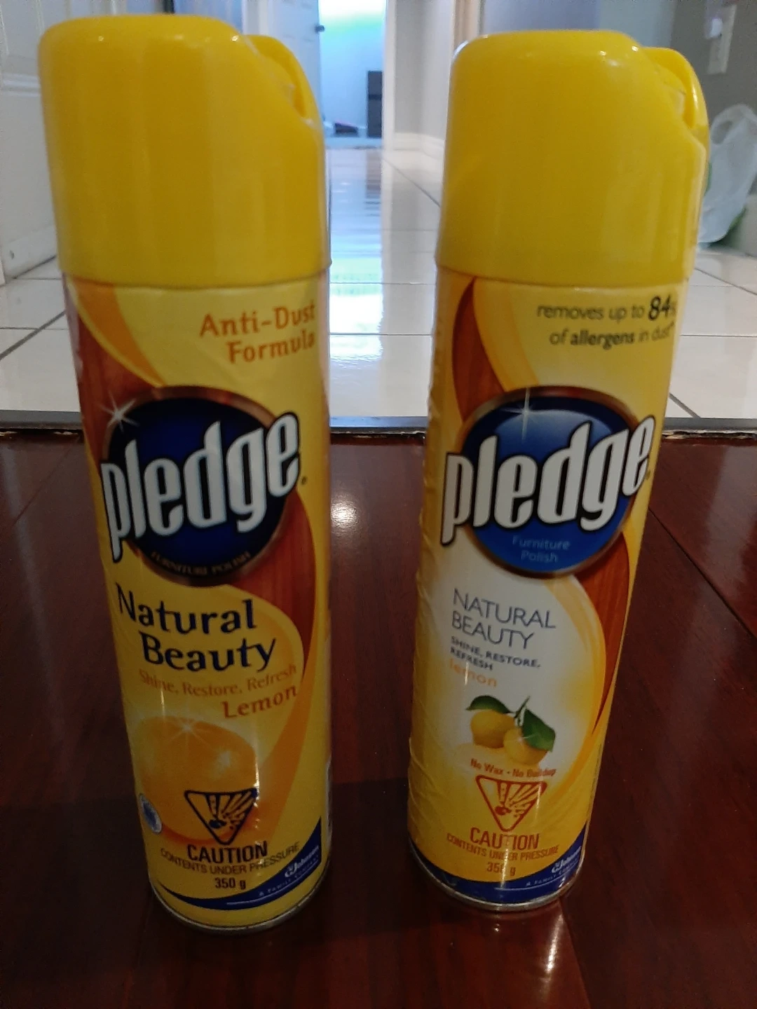 I'm selling two cans of Pledge Natural Beauty Furniture Polish with a lemon scent. It removes up to 84% of allergens in dust and has an anti-dust formula.
