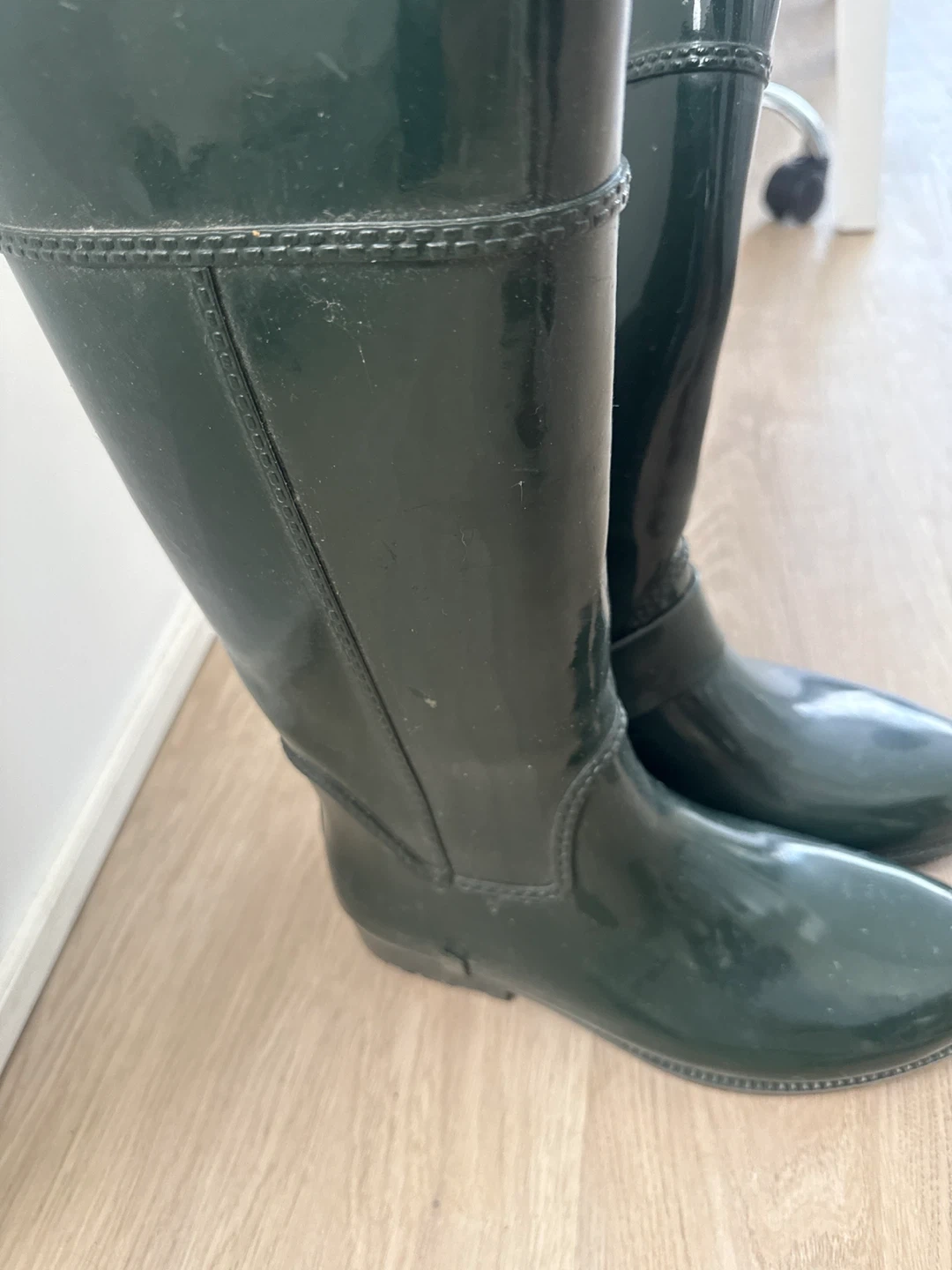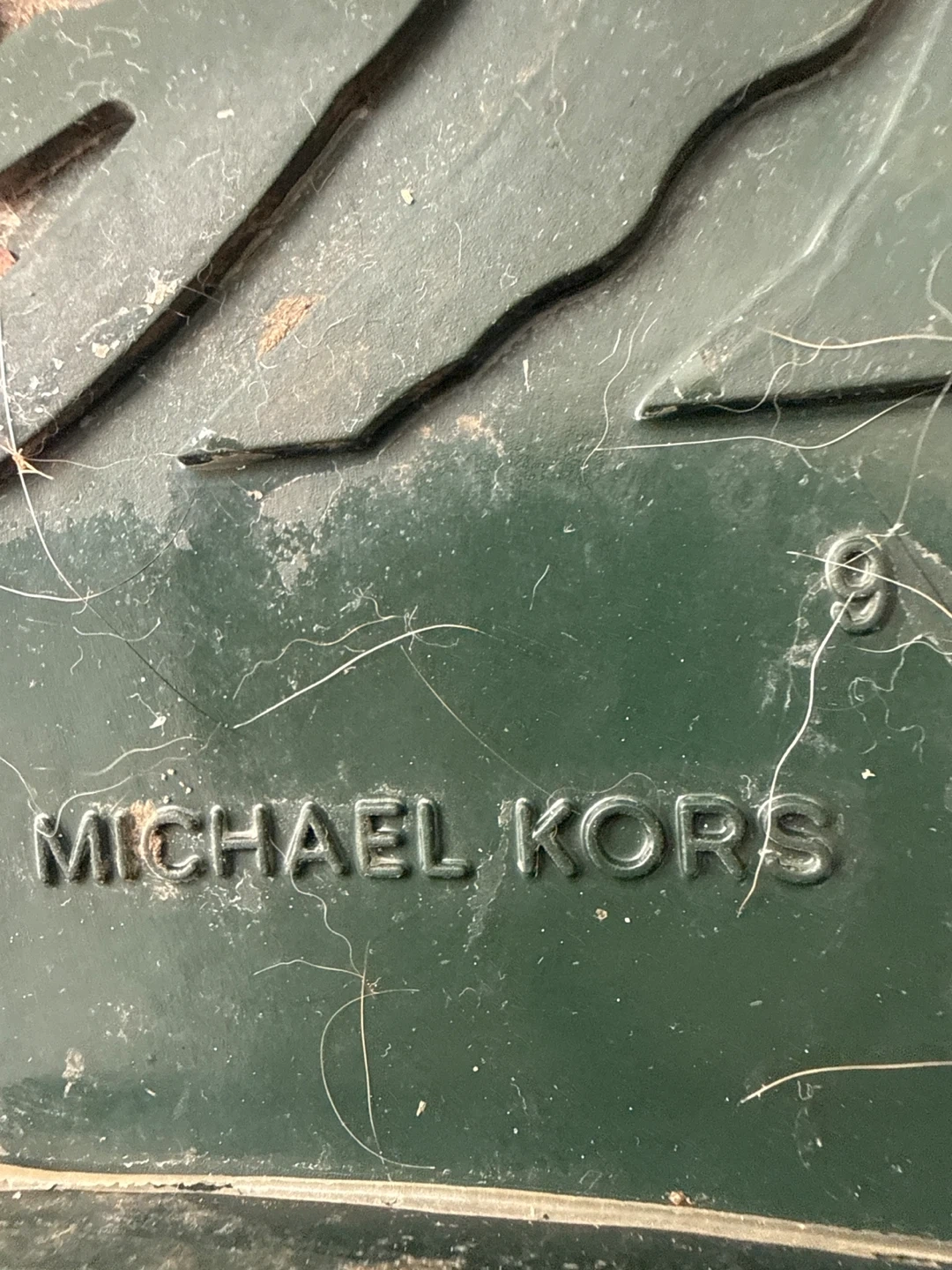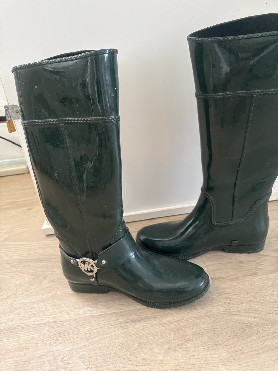 Selling a pair of Michael Kors rain boots in a dark green colour. They are size 9 and in good condition. Perfect for rainy days!