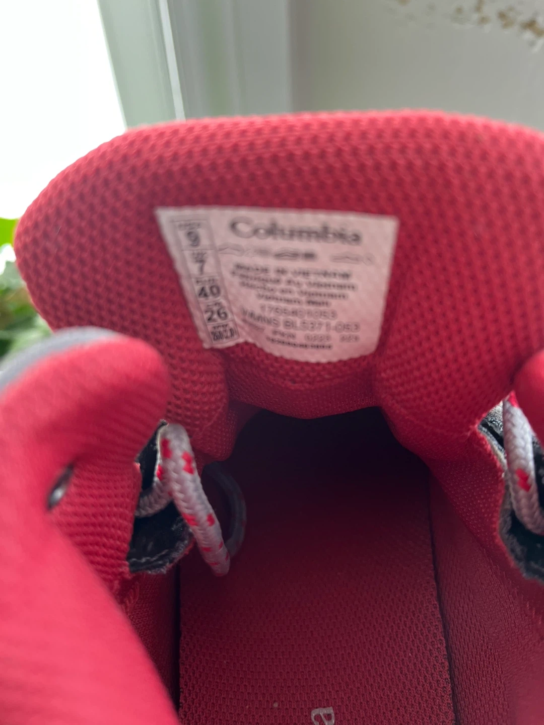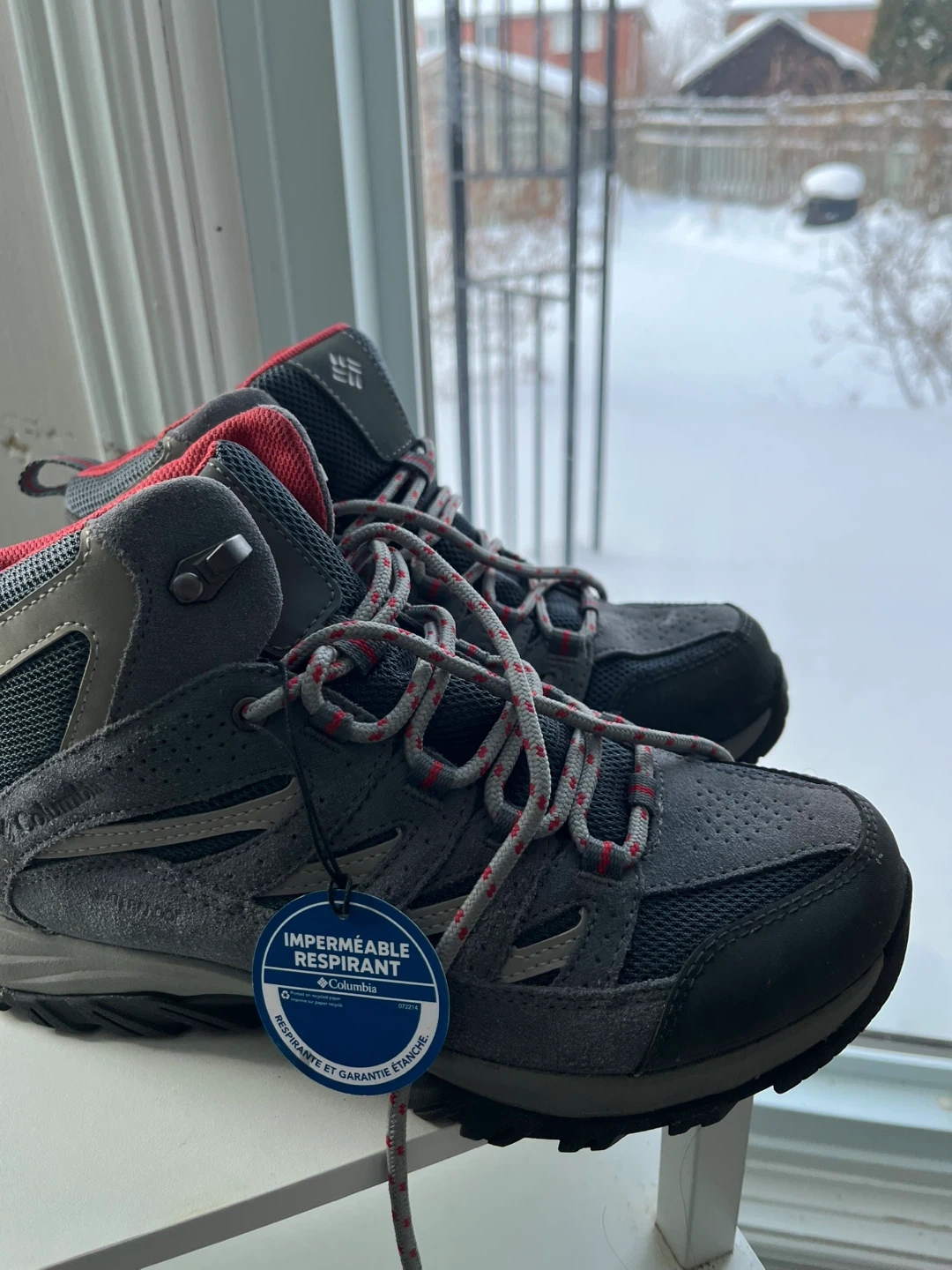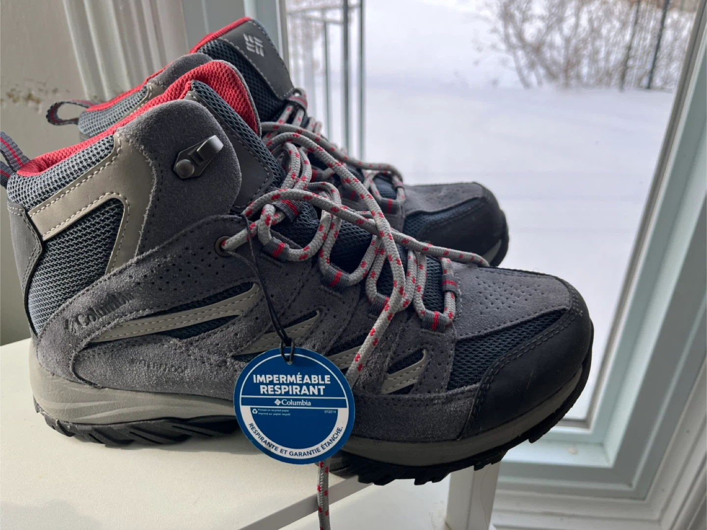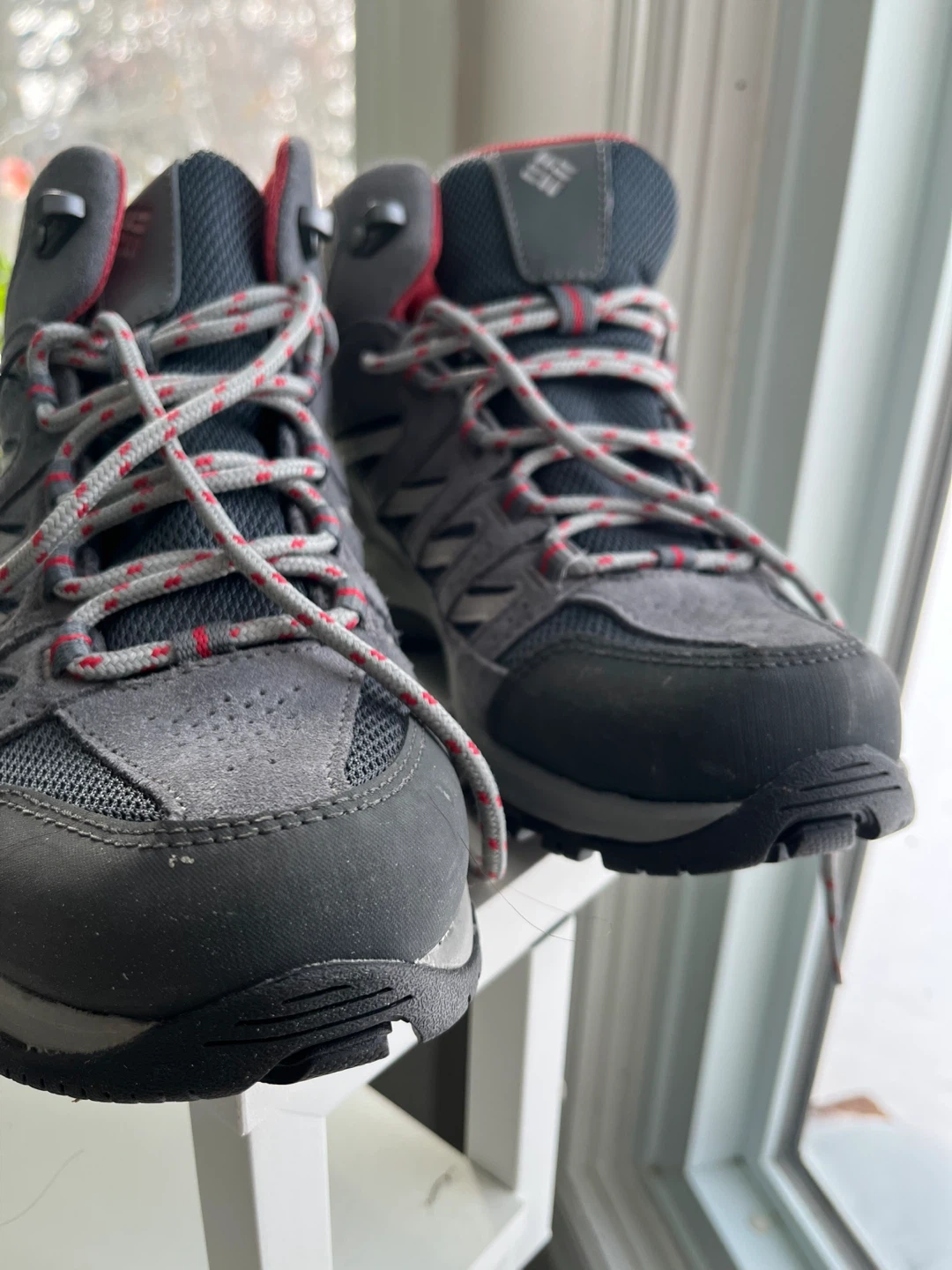 Columbia women's hiking boots, size 9. They are grey with red accents and have a waterproof design. Perfect for hitting the trails!