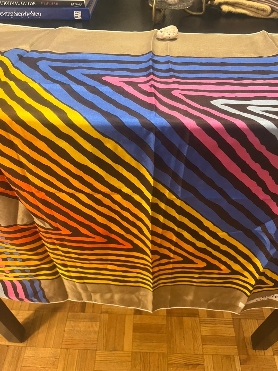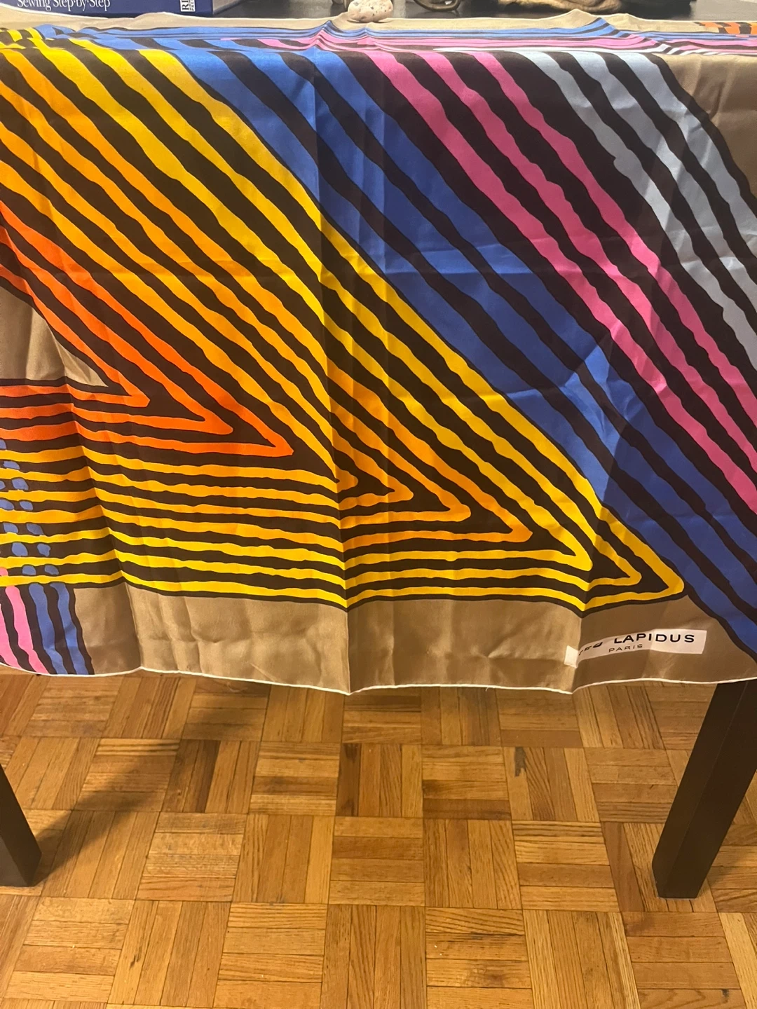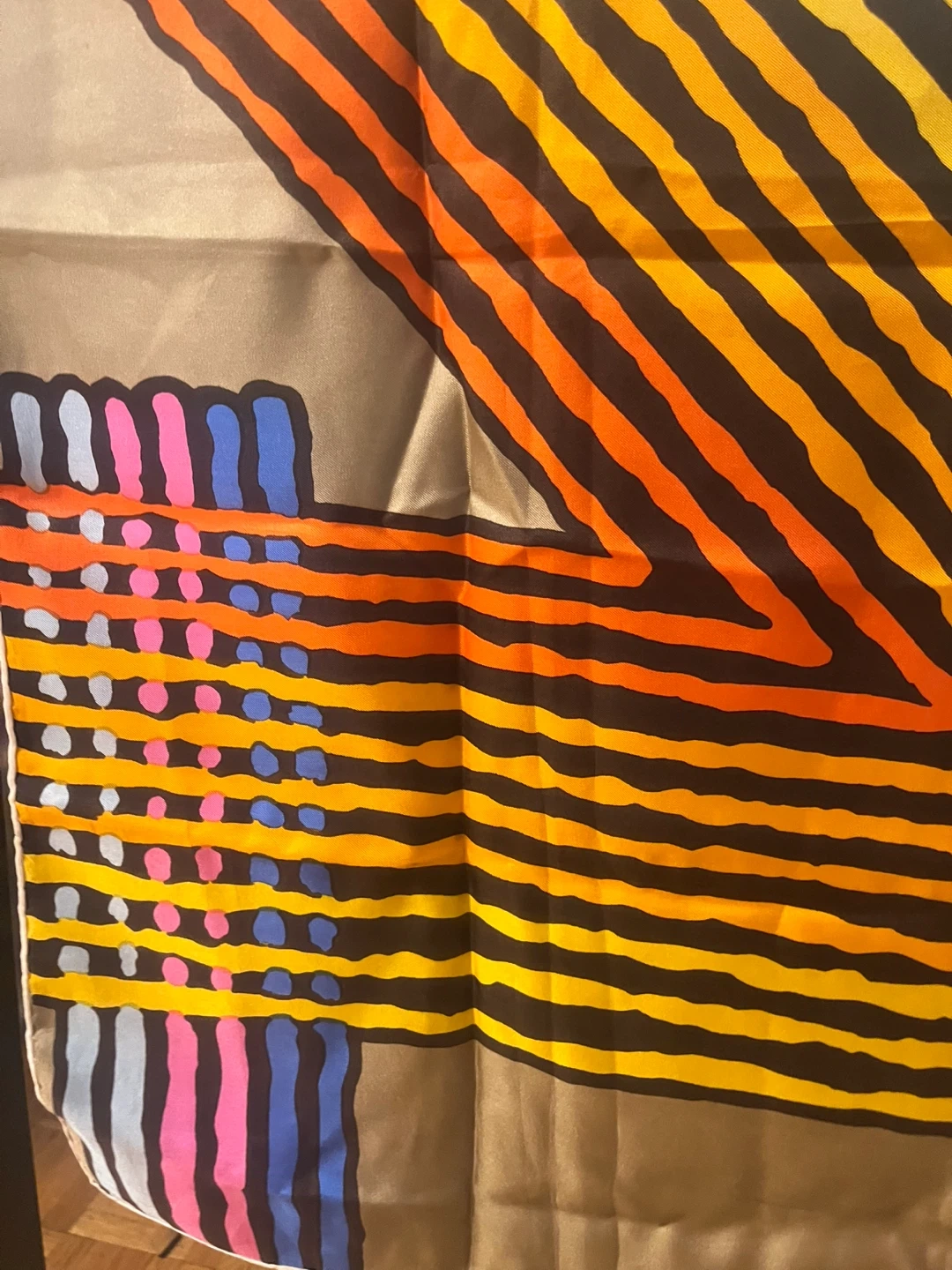 A vintage Ted Lapidus Paris scarf with a bold, colourful striped pattern. It features shades of orange, yellow, blue, and pink against a dark background with a brown border. This scarf is a vibrant accessory!