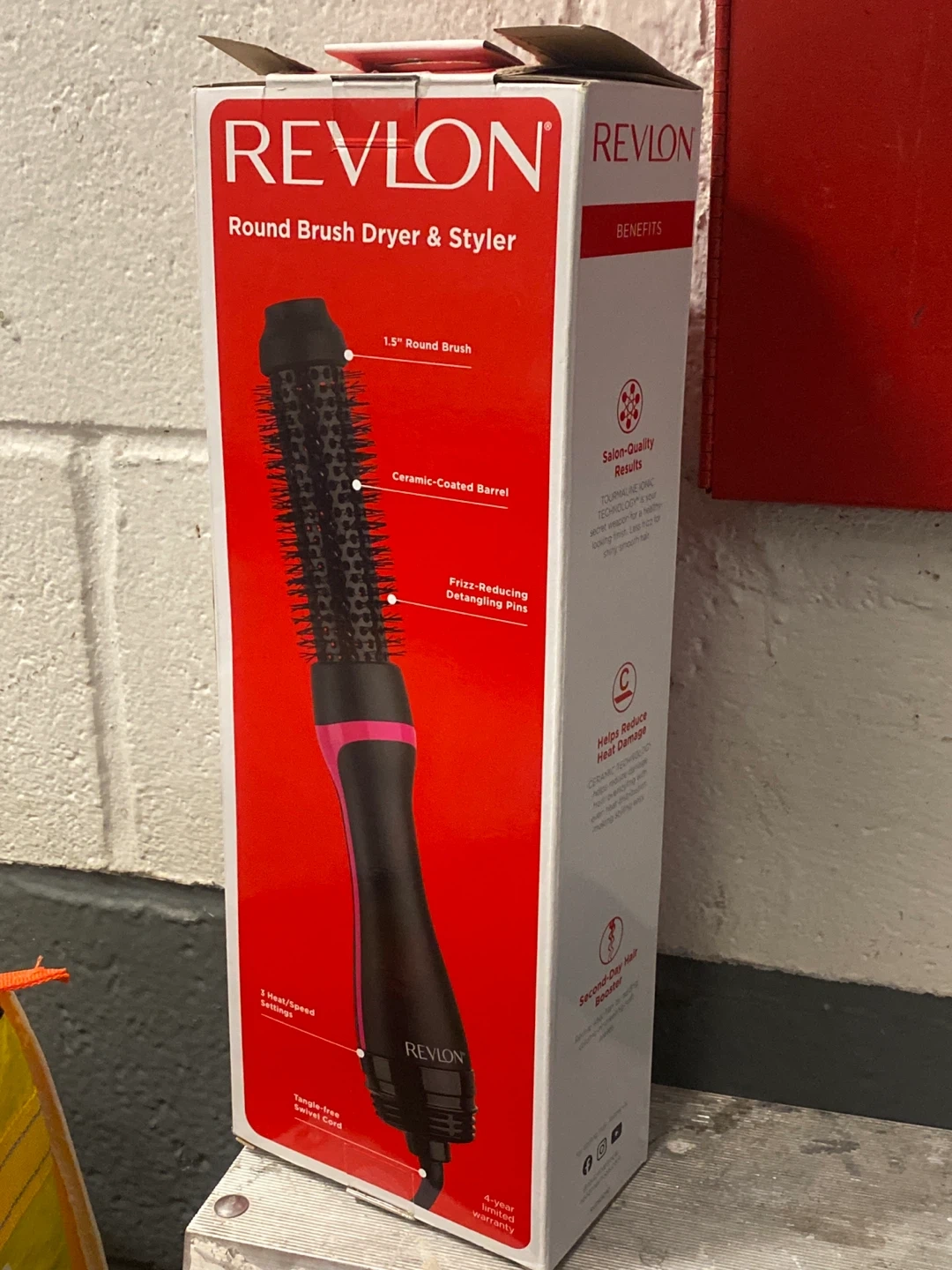 This Revlon Round Brush Dryer & Styler features a 1.5" round brush with ceramic-coated barrel and frizz-reducing detangling pins. It has 2 heat/speed settings and a tangle-free swivel cord. It also includes Tourmaline Ionic Technology for salon-quality results and helps reduce heat damage.