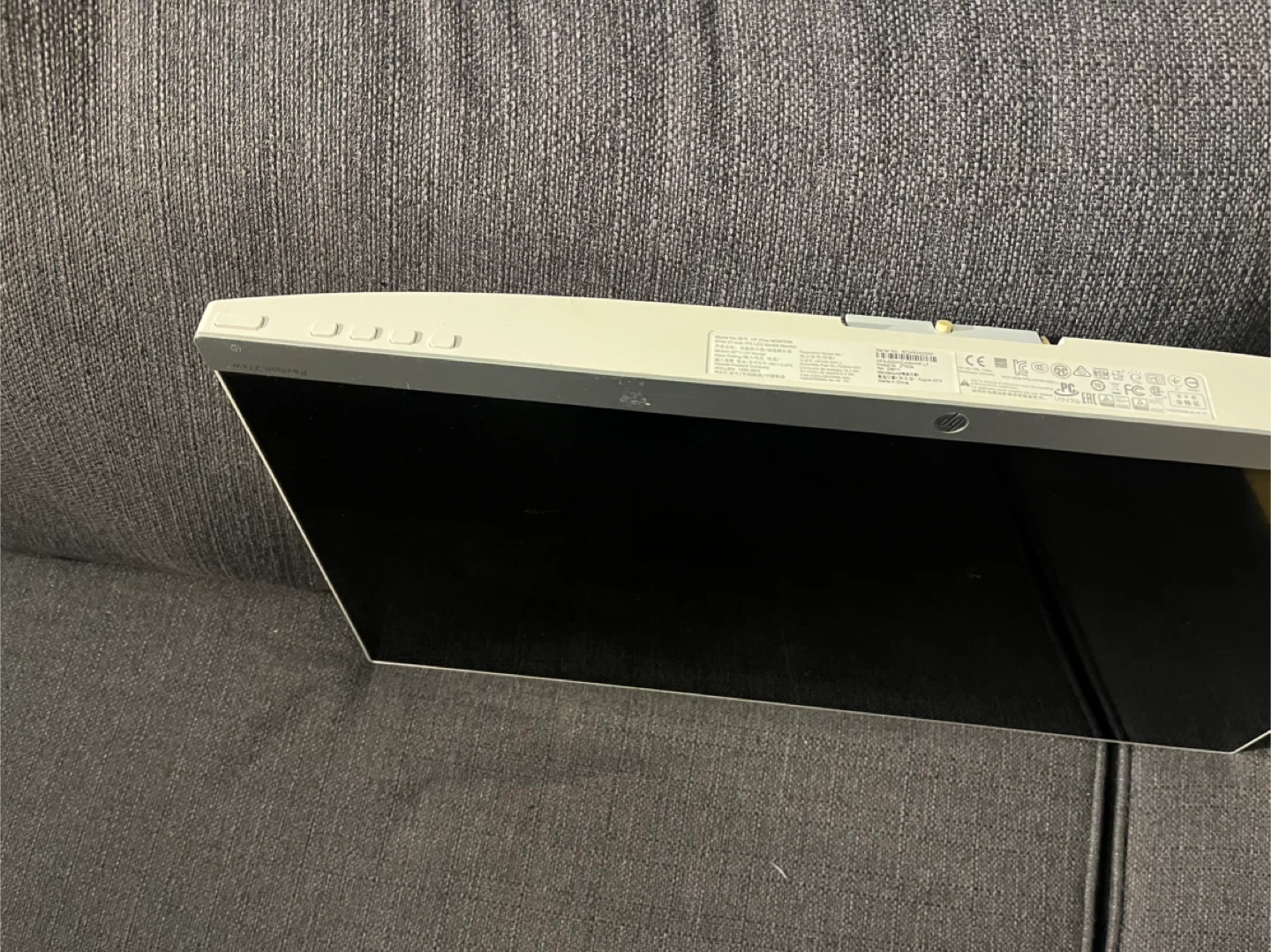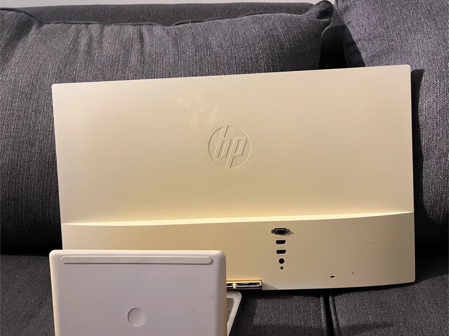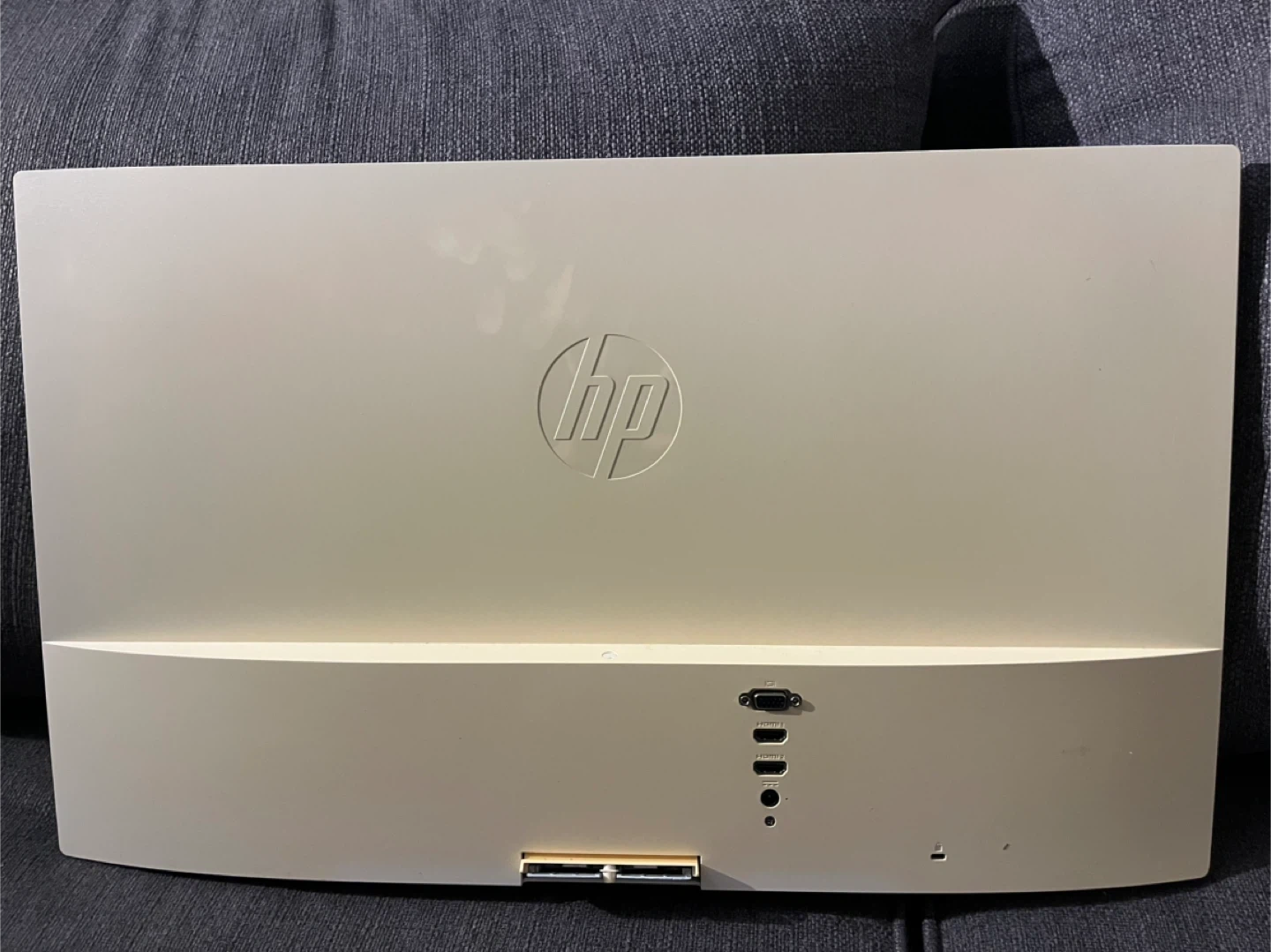 This is an HP All-in-One computer monitor. It has a cream-coloured back with the HP logo. The screen is black with a silver bezel.