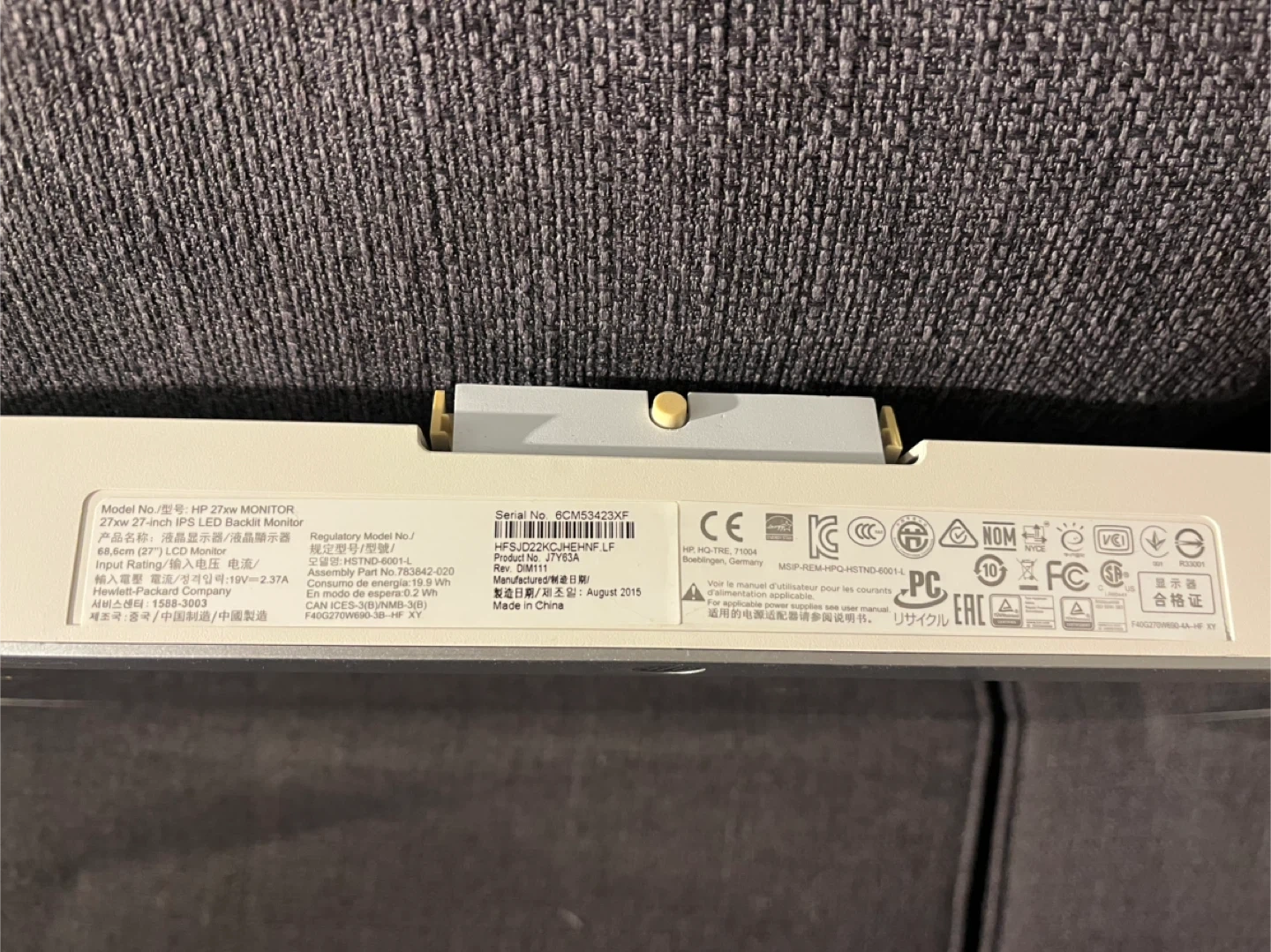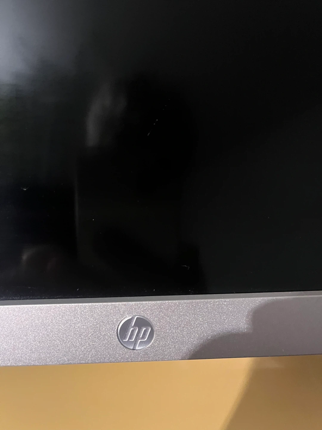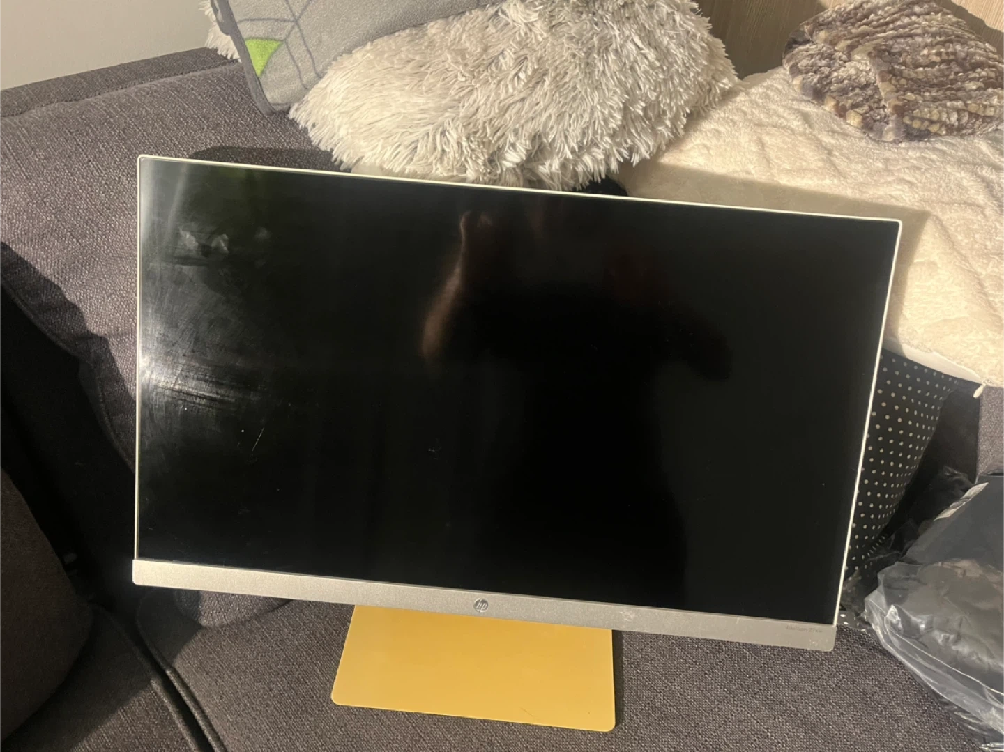 This is an HP All-in-One computer monitor. It has a cream-coloured back with the HP logo. The screen is black with a silver bezel.