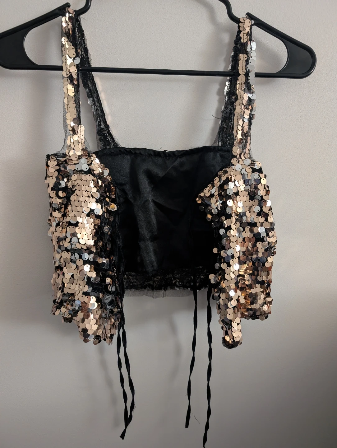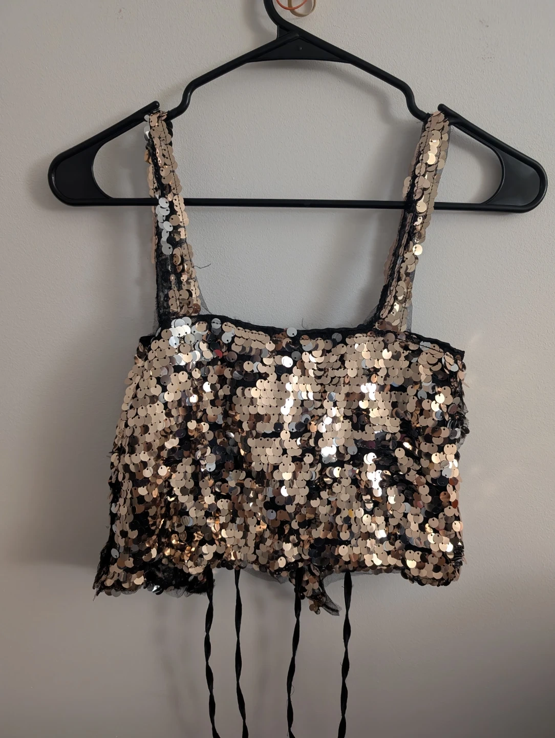Sparkly cami top with all-over sequins. Features adjustable tie closures in the back. Perfect for a night out!