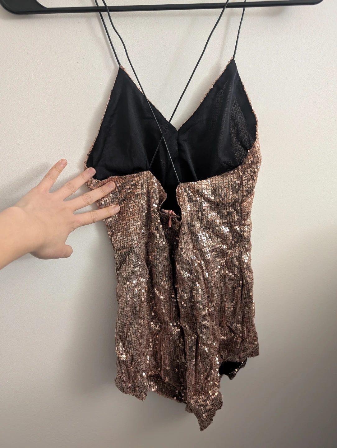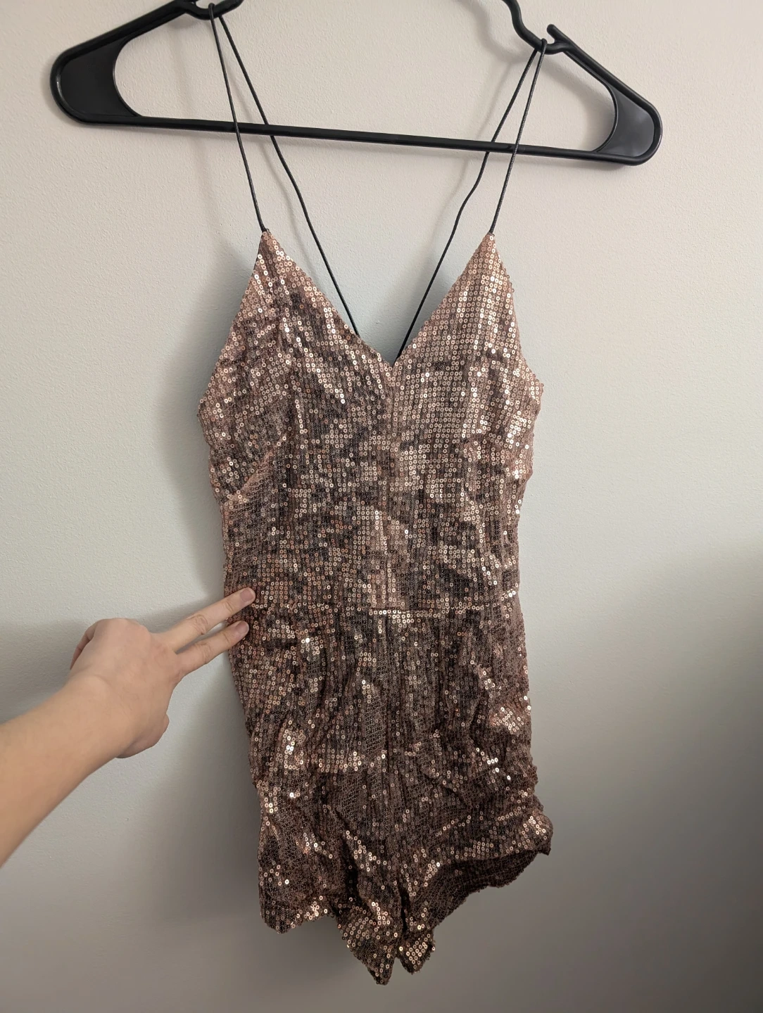 Sparkly rose gold sequin romper with spaghetti straps and a low back. It's perfect for a night out or a special occasion! Cross back with sequins all over.