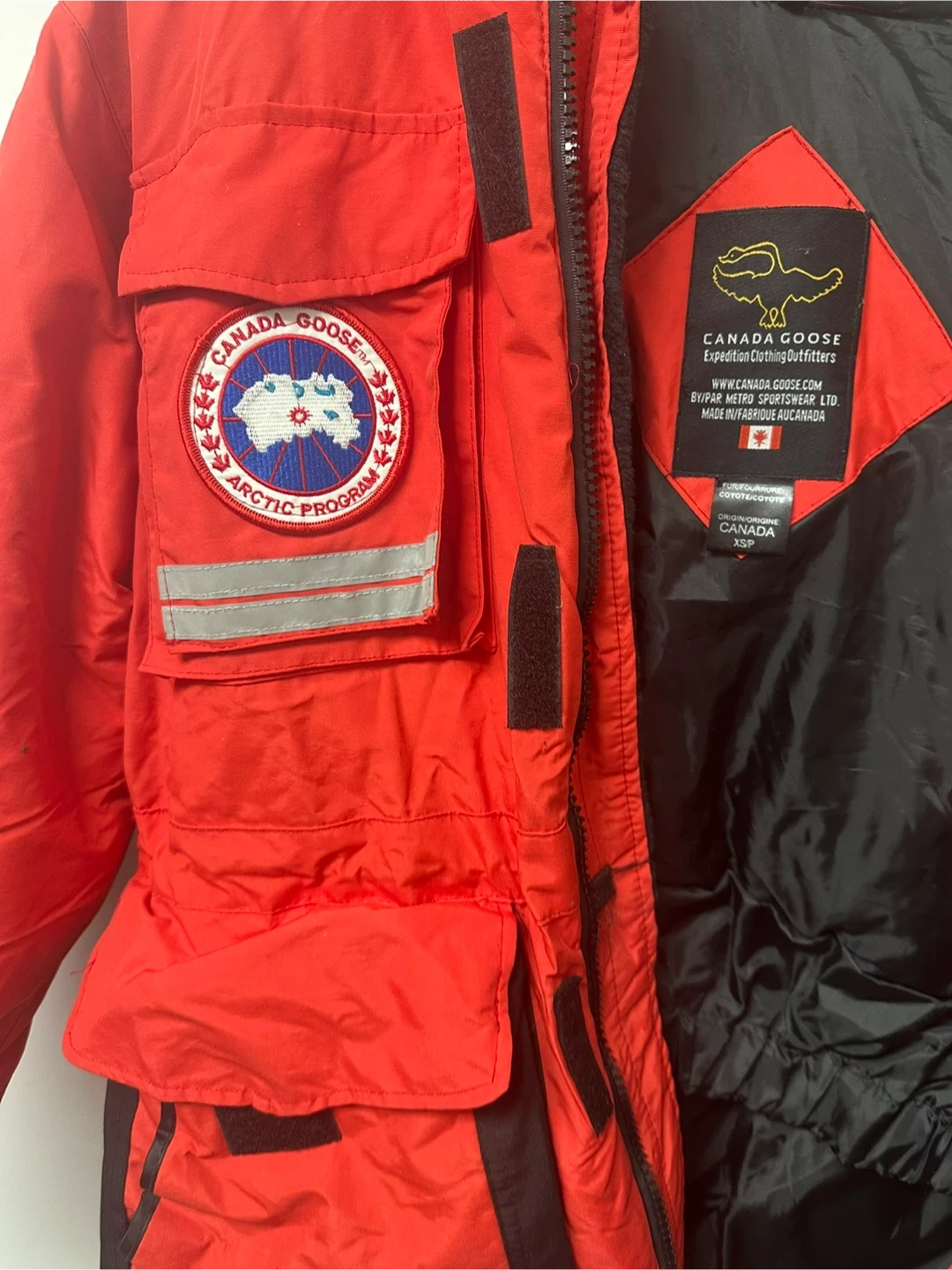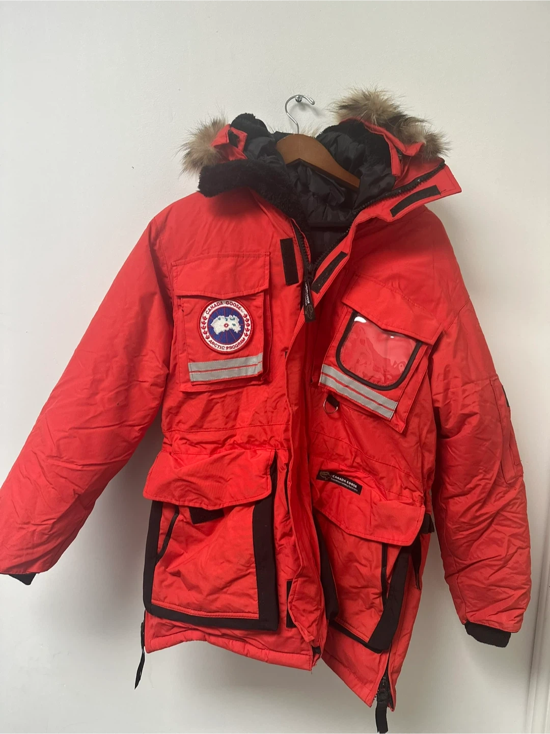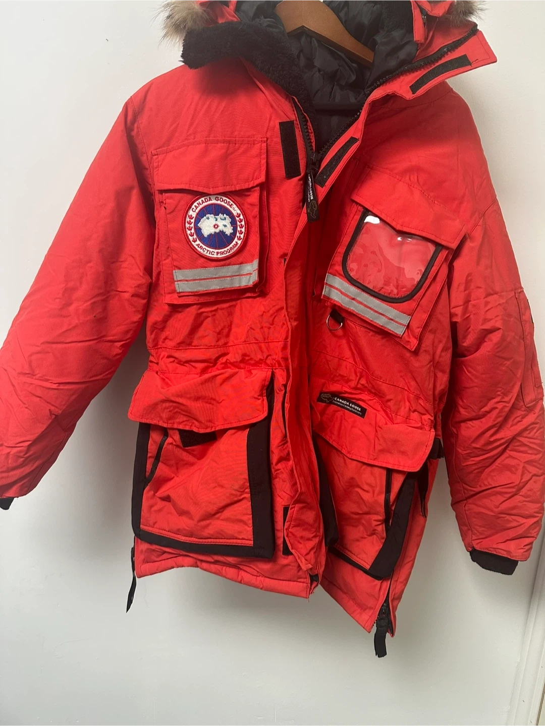 This is a Canada Goose Snow Mantra parka in red. It features multiple pockets and a fur-lined hood. Material is windproof and water-resistant.