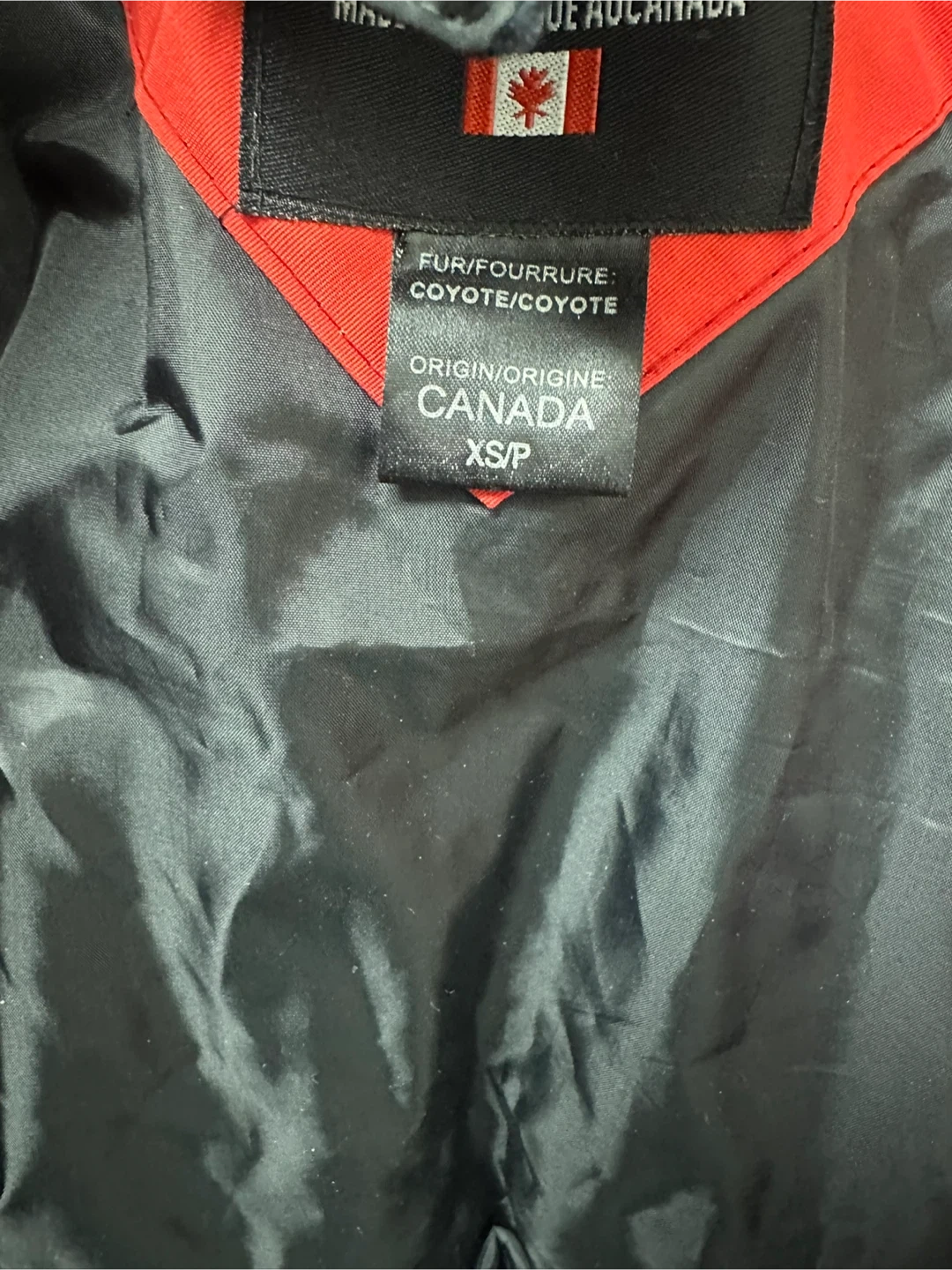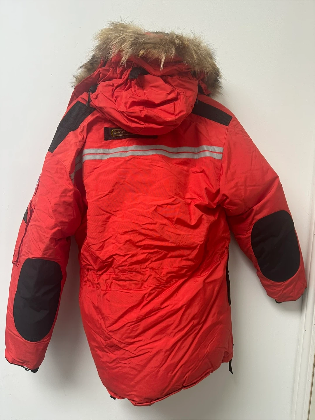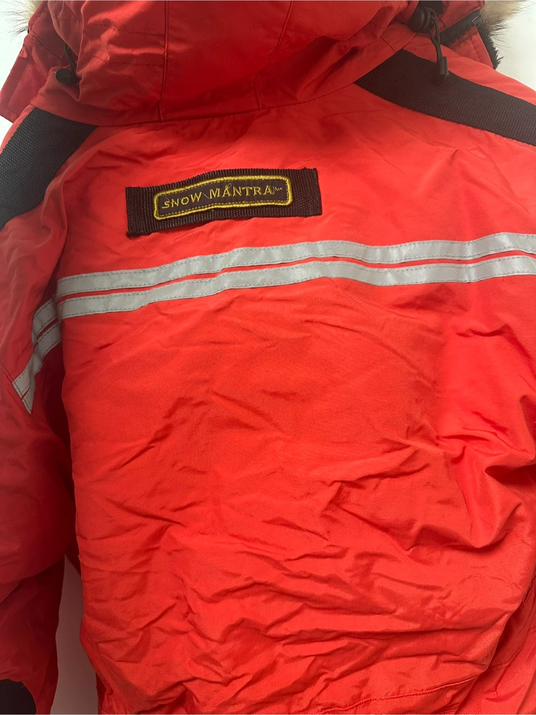 This is a Canada Goose Snow Mantra parka in red. It features multiple pockets and a fur-lined hood. Material is windproof and water-resistant.