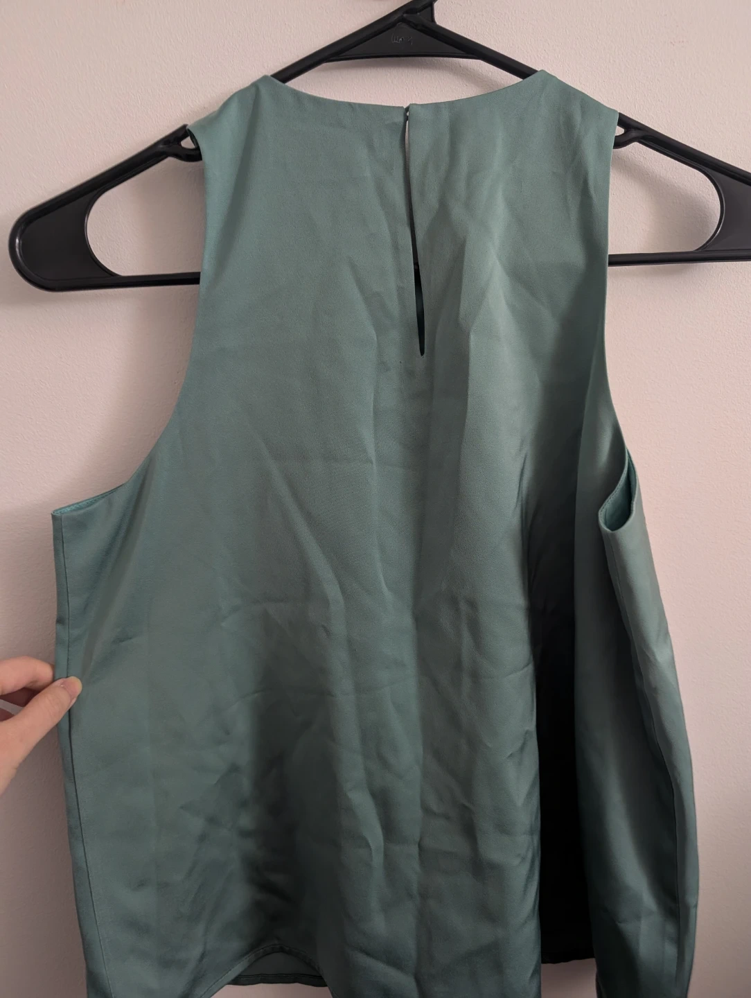This Love Bonito sleeveless blouse comes in a lovely teal color. It's a size S. The material feels silky smooth, and it has a unique draped front detail. This top is great for dressing up or down!