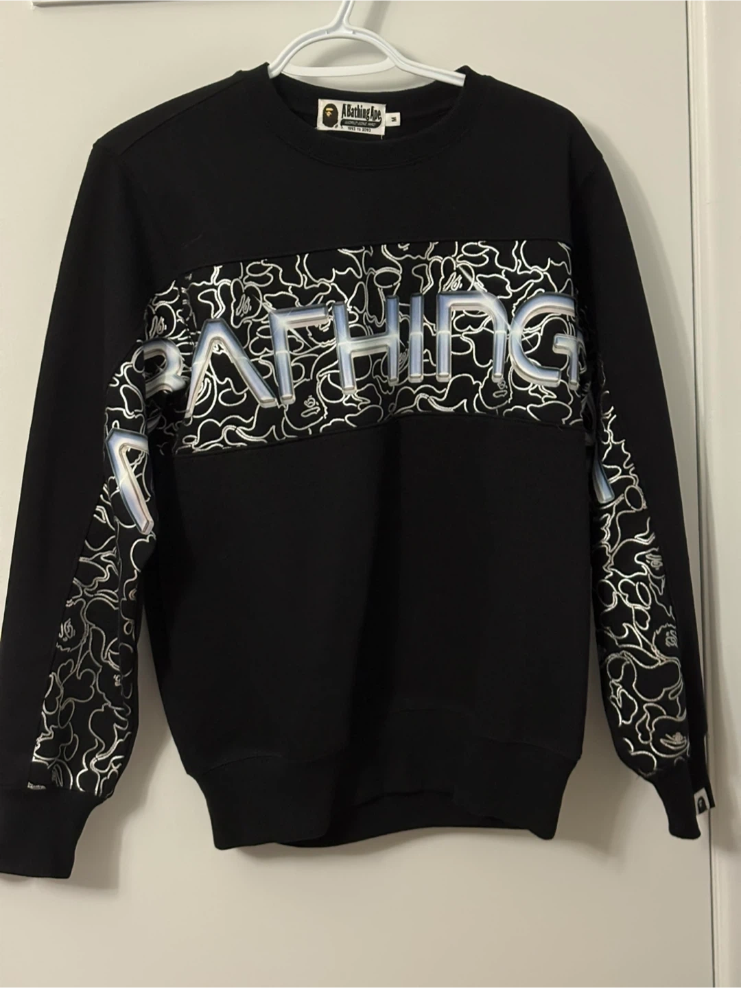 Black A Bathing Ape crewneck sweatshirt with a Hajime Sorayama graphic. It's a size medium and made of cotton blend material. This crewneck features a unique reflective graphic on the front and sleeves. The back has a black patch with chrome detailing.
