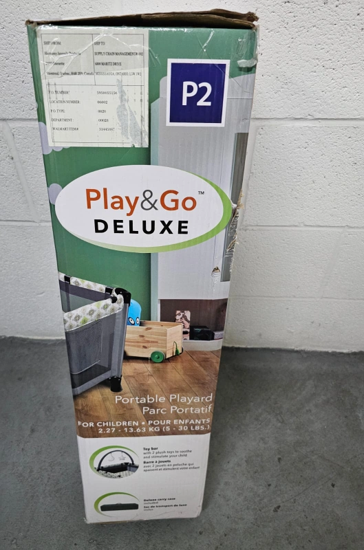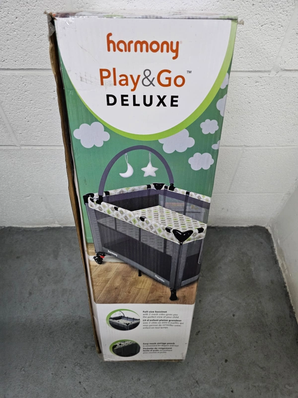 40" x 28" x 29" price is $99.97 at Walmart Description The Harmony Play & Go Deluxe playard is the newest addition to Harmony’s lineup of premium baby gear. This all-in-one playard builds on Harmony’s heritage of better materials, better construction and better price! The Play & Go Deluxe playard is the ideal solution for busy, on-the-go parents. The lightweight, ultra-compact frame opens and closes in seconds for true hassle-free assembly. Now your child can rest or play in absolute safety both indoors and out. Do you have dinner plans at Grandma’s? Taking a weekend trip out of town? No problem! Fully featured and designed for portability, the Play & Go Deluxe is your ultimate companion from infant to toddler. Your newborn will rest well within the spacious bassinet or remove the bassinet and your toddler can play in the full size playard. The Play & Go is equipped with a convenient storage pouch for diapers and a toy bar to stimulate your baby’s senses. While at home or on the move, go ahead and reach for the Harmony Play & Go Deluxe Playard. Specifications. Assembled weight: 19.4 lbs. Model #: 080100 • Harmony 080100 Play & Go Deluxe Playard •For children 2.27 – 13.6 kg (5 – 30 lbs.). •Full size playard provides a safe and comfortable environment. •Includes a full-size bassinet for children up to 6.8kg /15 lbs. •4 mesh sides for increased airflow and for a perfect view of your child at all times. •Lightweight and compact design for travel or storage. •Easy-reach storage pouch is convenient for diapers, wipes or toys. •2 lockable wheels for easy movement between rooms. •Toy bar with 2 plush toys to soothe and stimulate your child. •Carry case included. •1-year warranty.