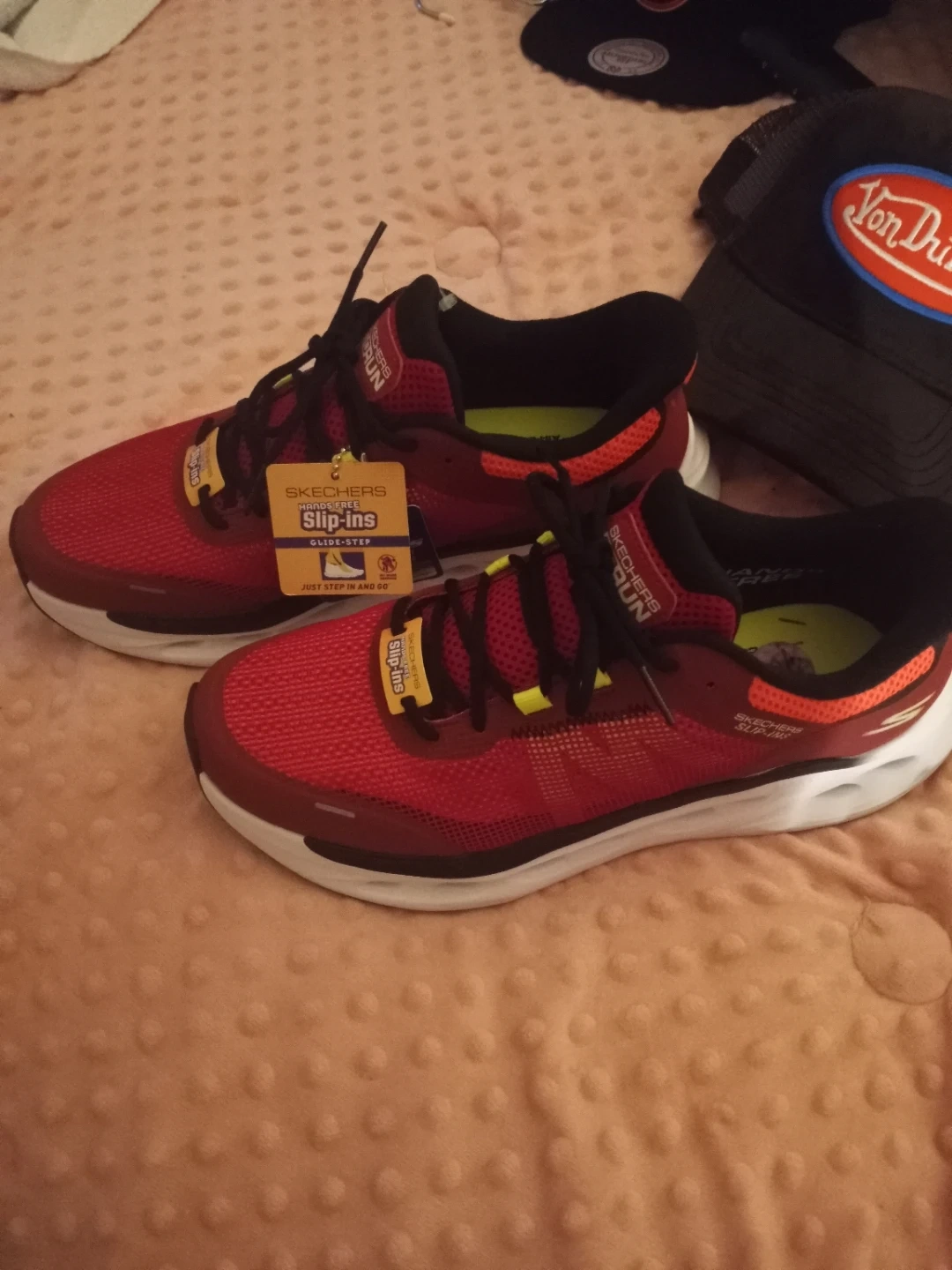 Skechers running shoes with Hands Free Slip-ins technology. Features Glide-Step cushioning for comfort. These shoes are red with black laces and bright orange accents.