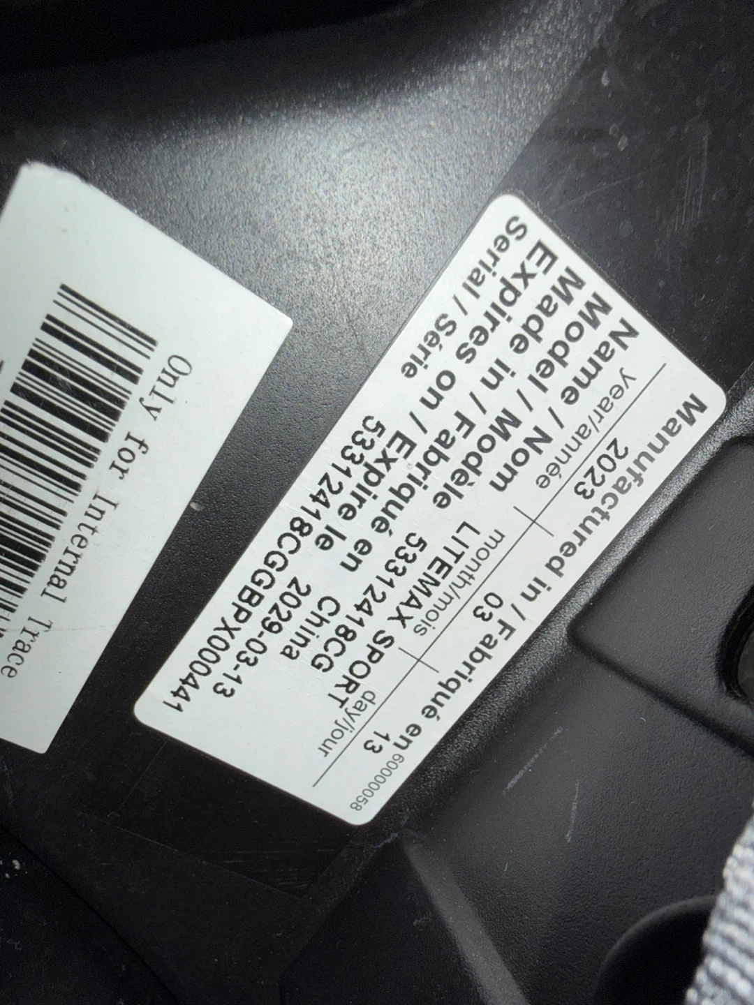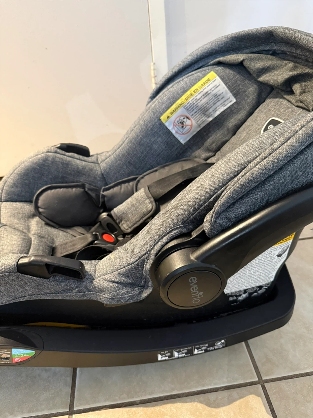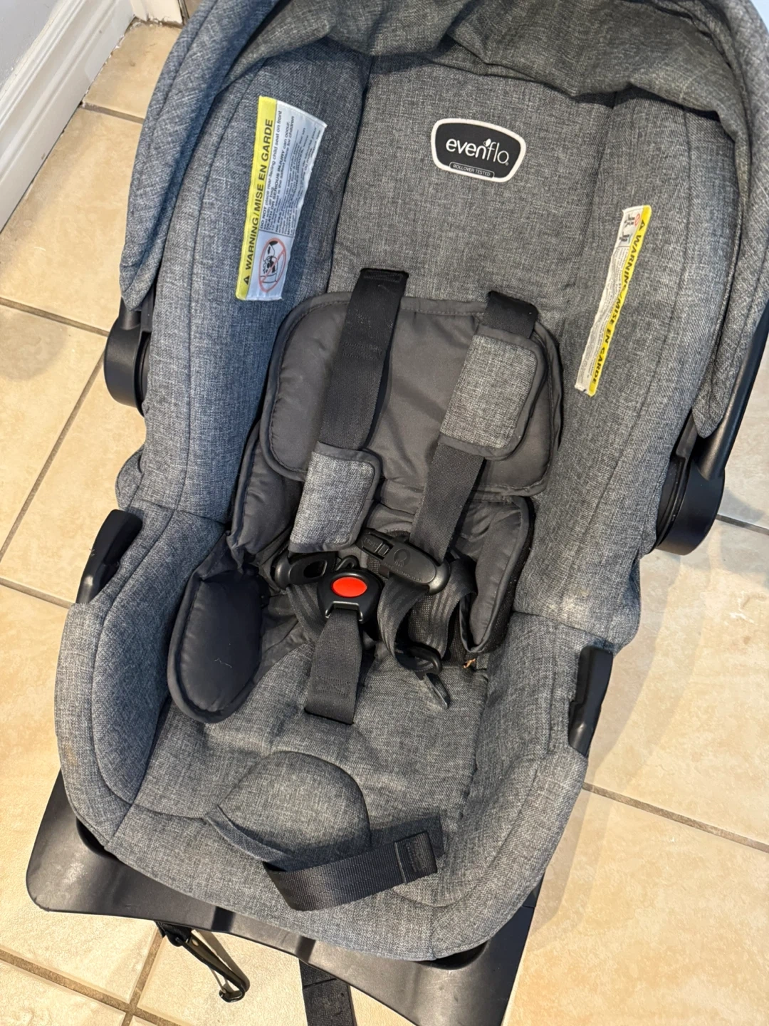 Evenflo Litemax Sport infant car seat. Expires on 2029-03-13. Gray heather fabric.