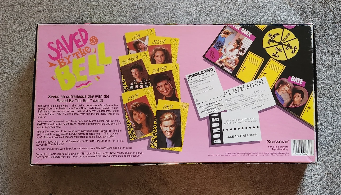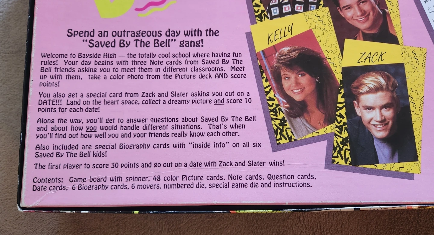 Be the first player to score 30 points. To score points, you must land on a classroom space and have a matching Note card. You also go out on a date with Zack and Slater and meet other Saved by the Bell kids in different places at Bayside High.