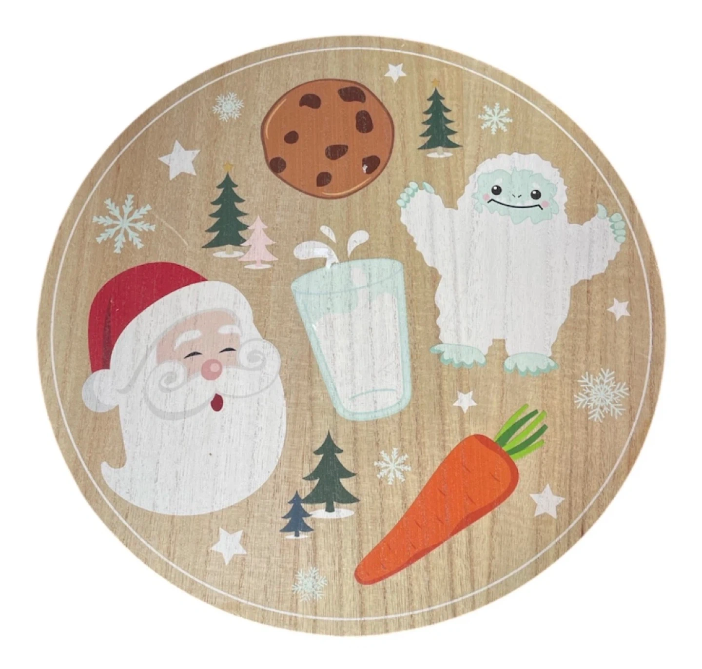 This round wooden plate features a festive Christmas Eve design with Santa, a yeti, a cookie, milk, and a carrot. It's perfect for leaving treats out for Santa. The plate is made of wood and is round.