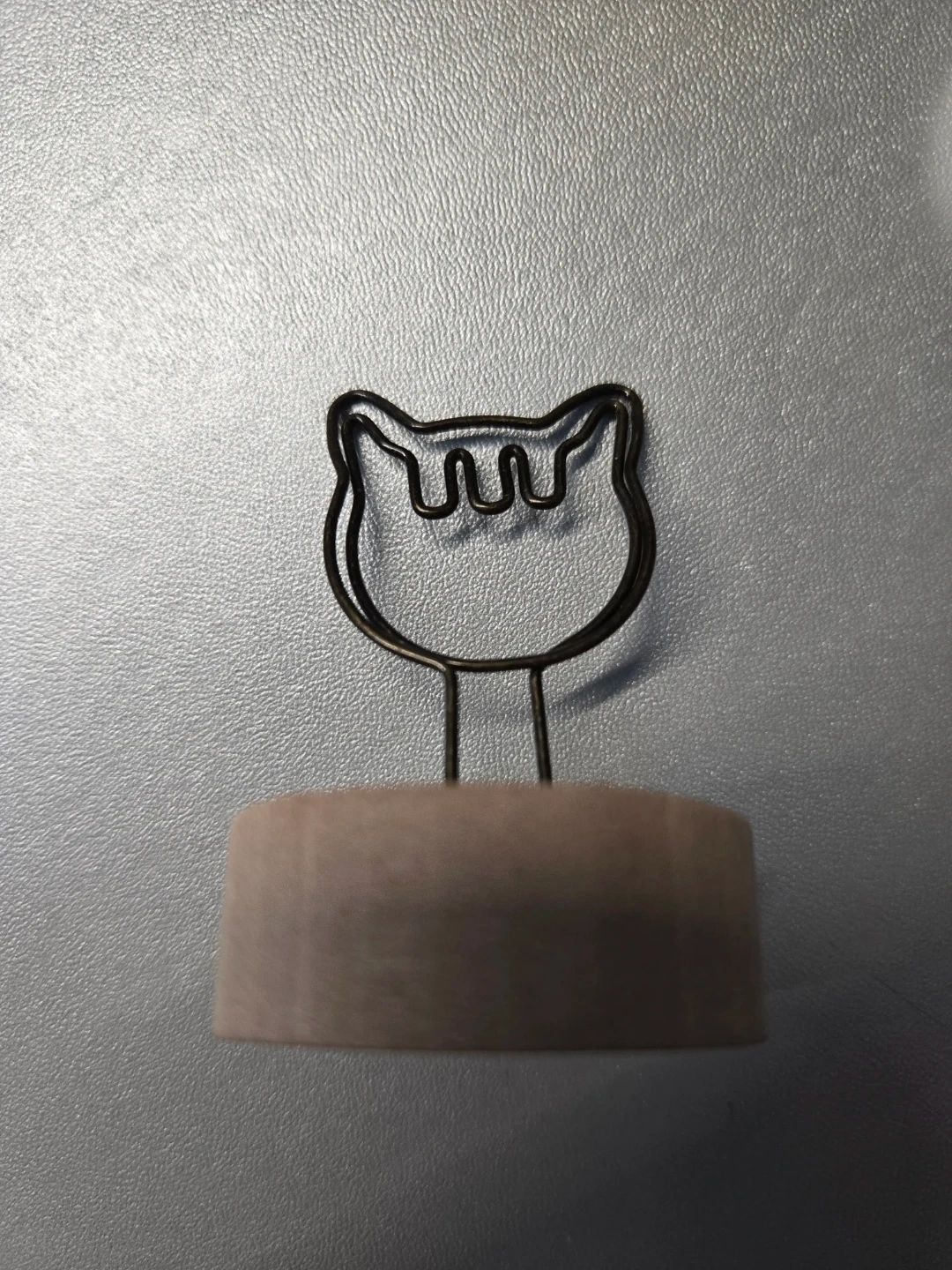 This is a charming paper clip holder shaped like a cat's head. It's made of black wire with a light brown, cylindrical base. It's perfect for keeping your desk tidy!