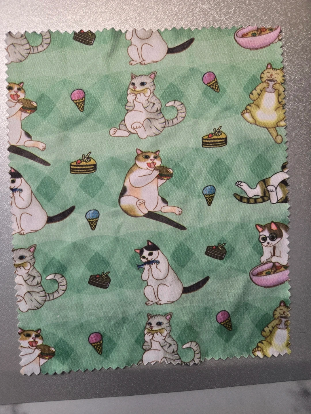 This fabric panel features a charming green pattern with various cats enjoying treats like ice cream, cake, and burgers. It's a fun material for crafting or sewing projects. The fabric has a unique diamond grid background.