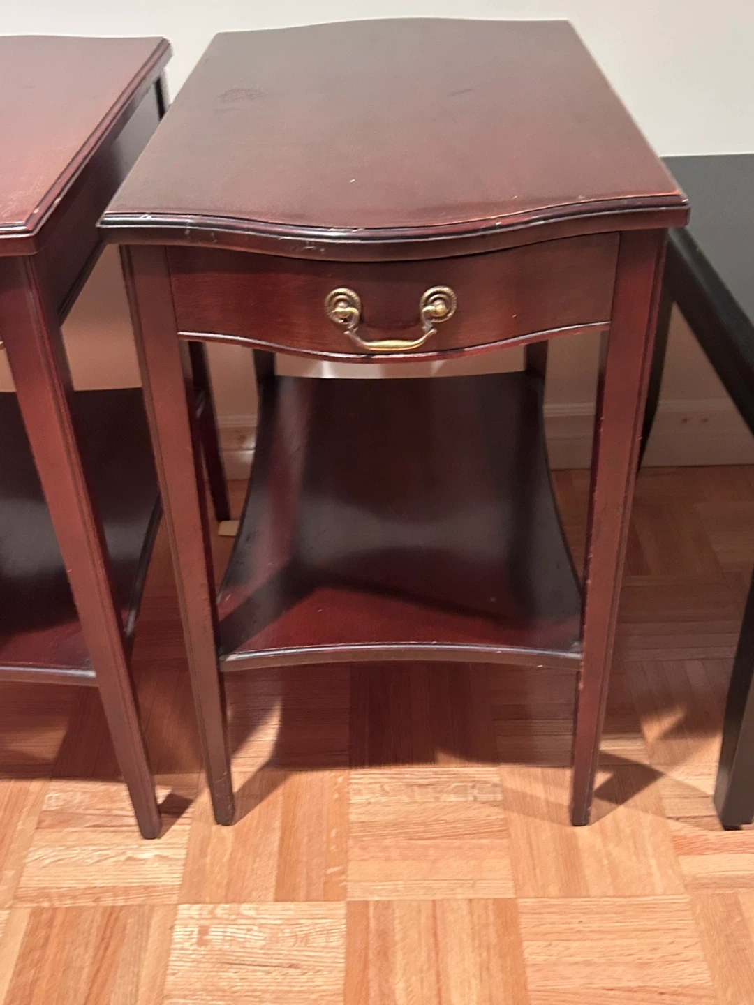 2 narrow side tables. 1 drawer and a shelf at the bottom. Very good condition. Both for $60