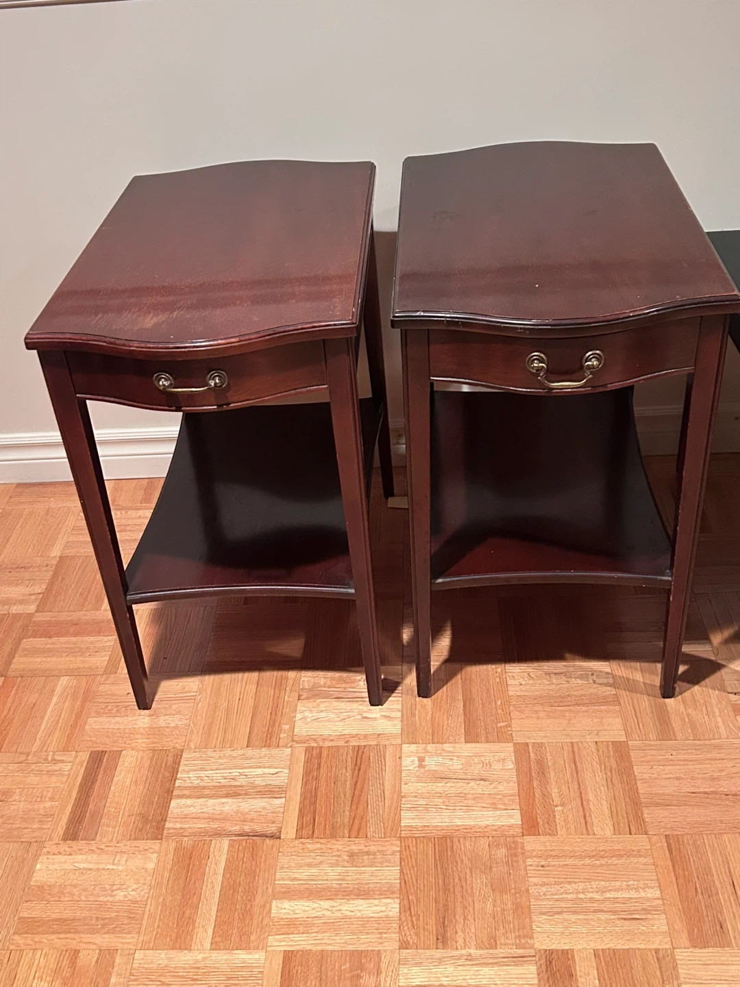 Very good condition. A little loss of stain on the top at the front but it can be easily touched up with a furniture marker. $60