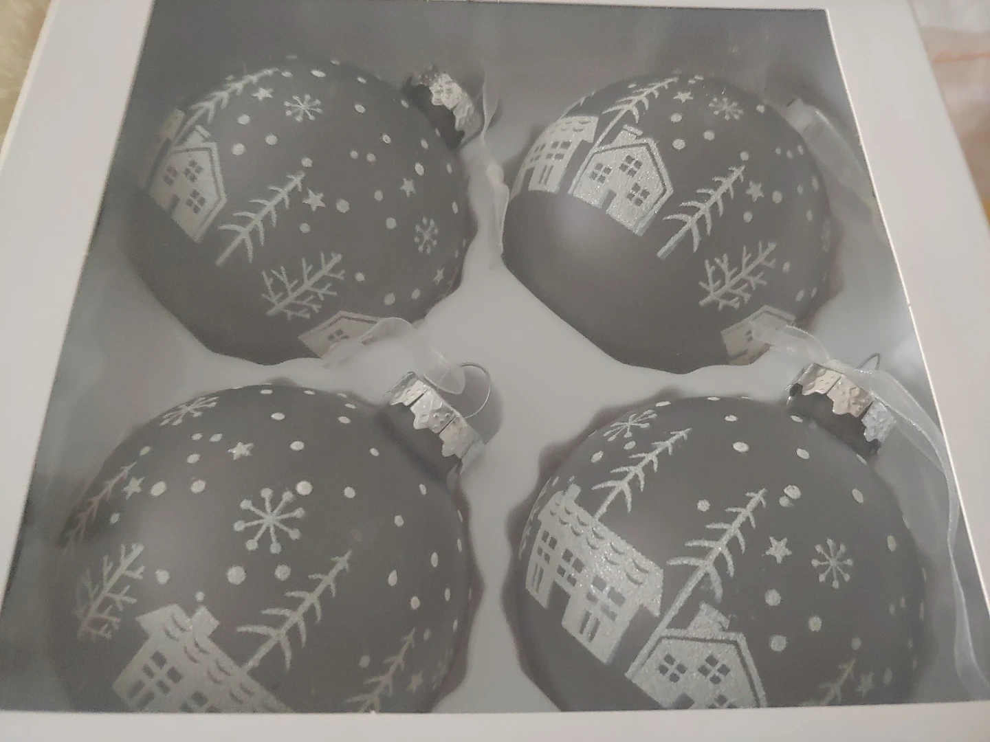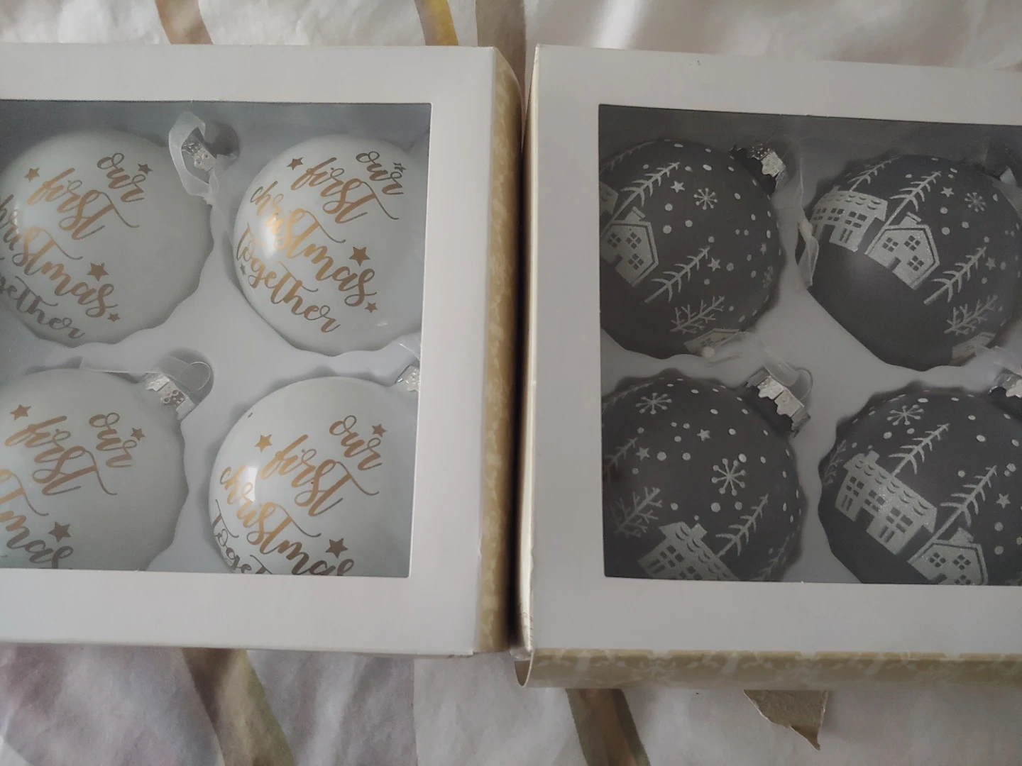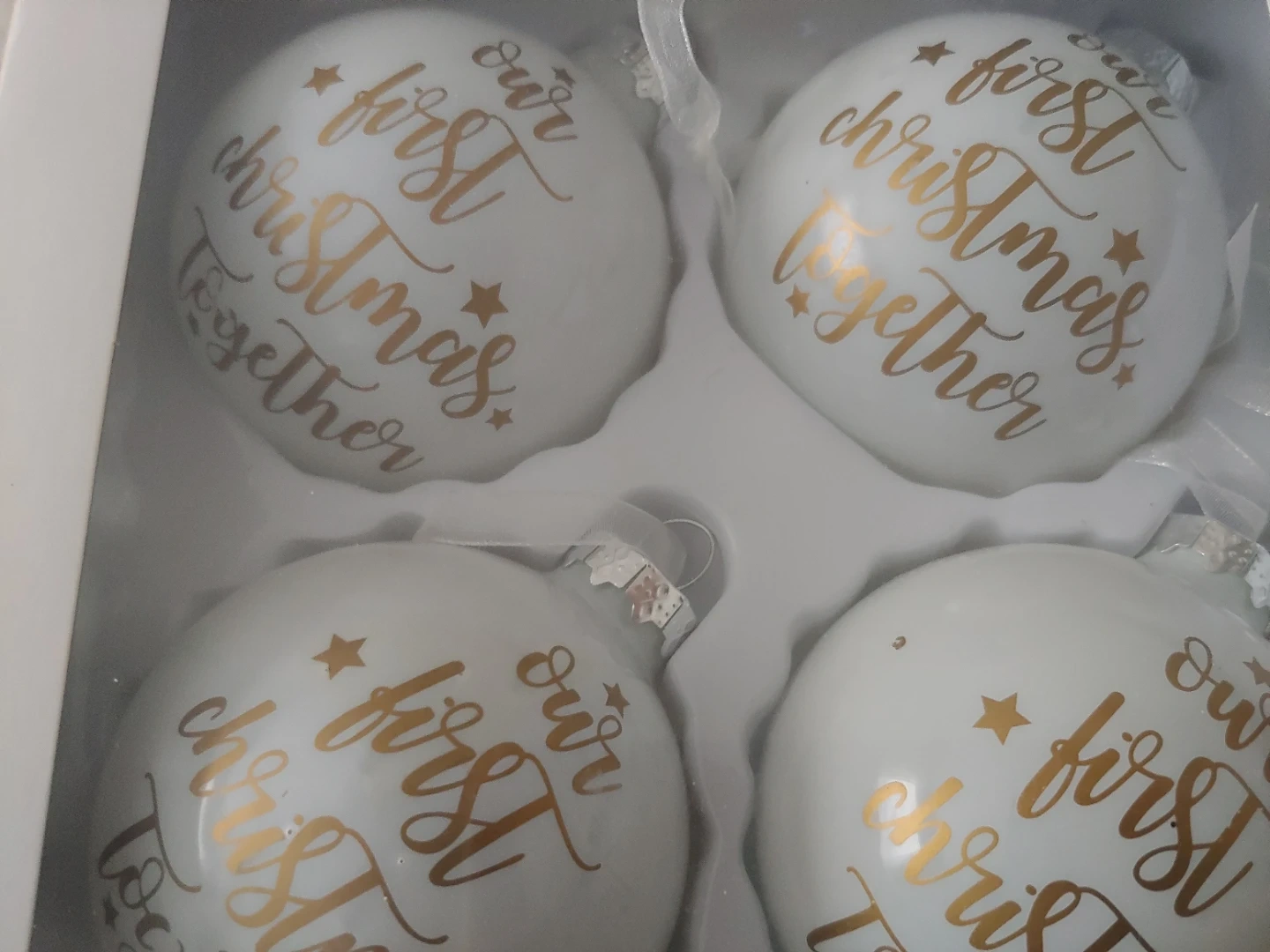 A set of eight Christmas ornaments, with four white ones saying 'our first christmas together' in gold lettering. The other four are grey with a white house and snowflake design.