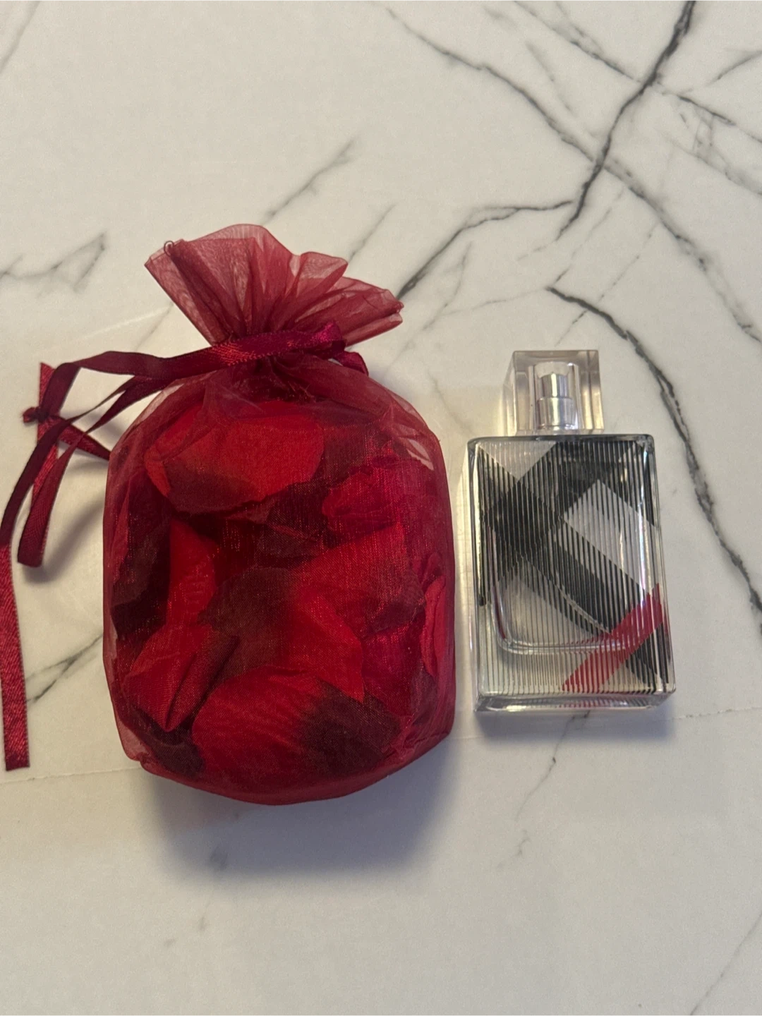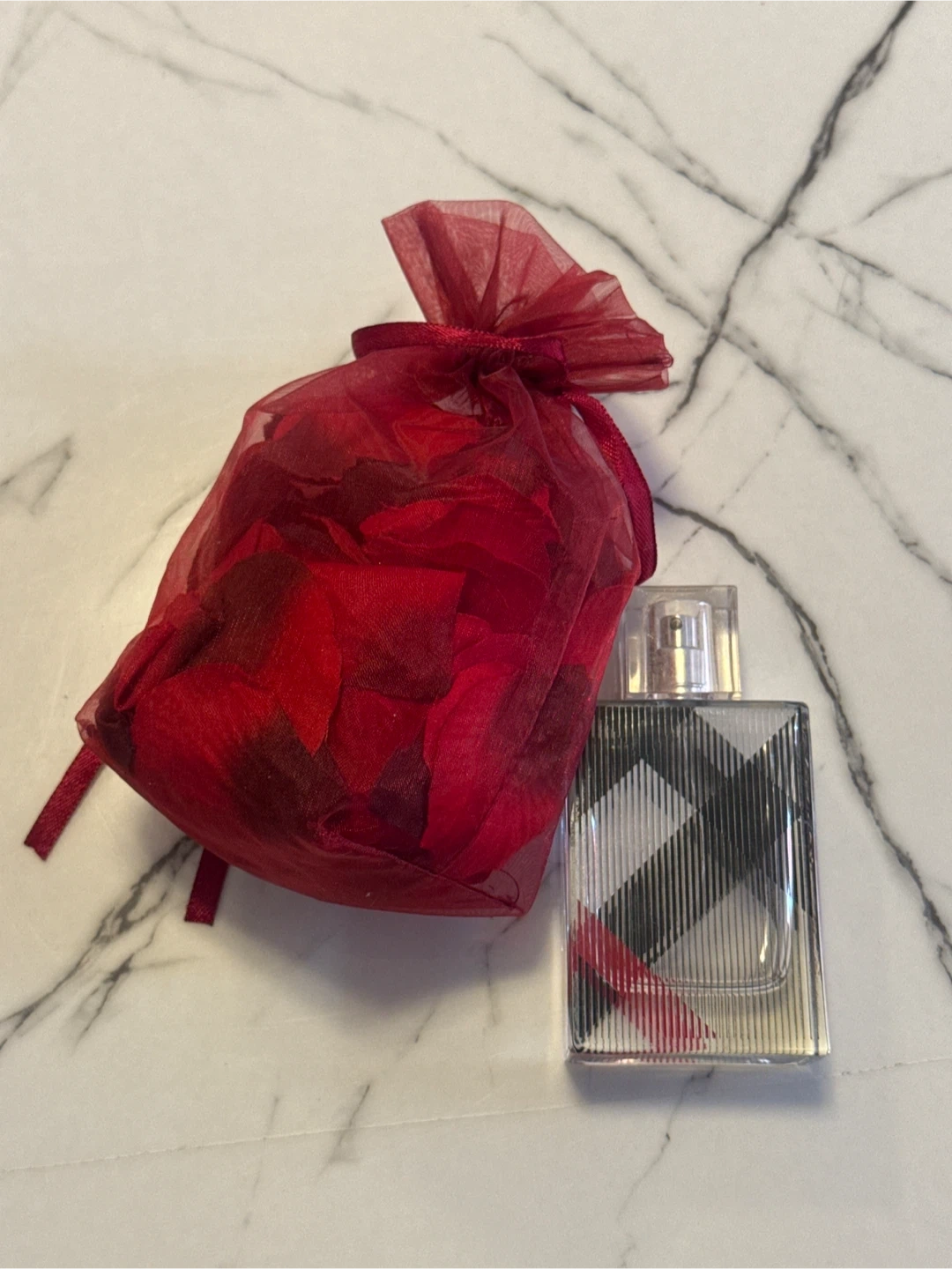 Empty Burberry Brit Spray Bottle and Sachet of Red Rose Petals