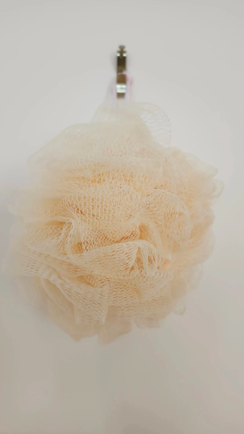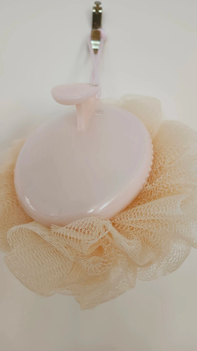 This shower brush features a pale pink oval-shaped handle and a creamy loofah puff. It's designed for gentle exfoliation during your shower routine. The loofah is made of mesh material.