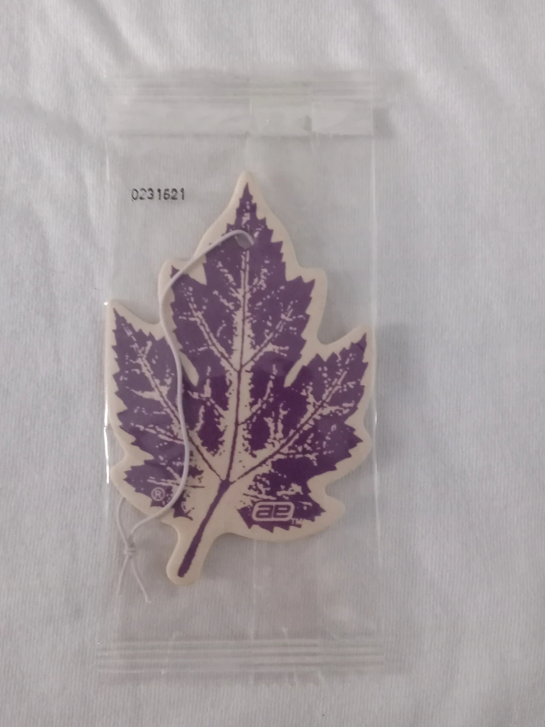 This air freshener is shaped like a purple maple leaf and smells like Wild Berries. It comes with a string for hanging. The product is sealed in its original packaging.