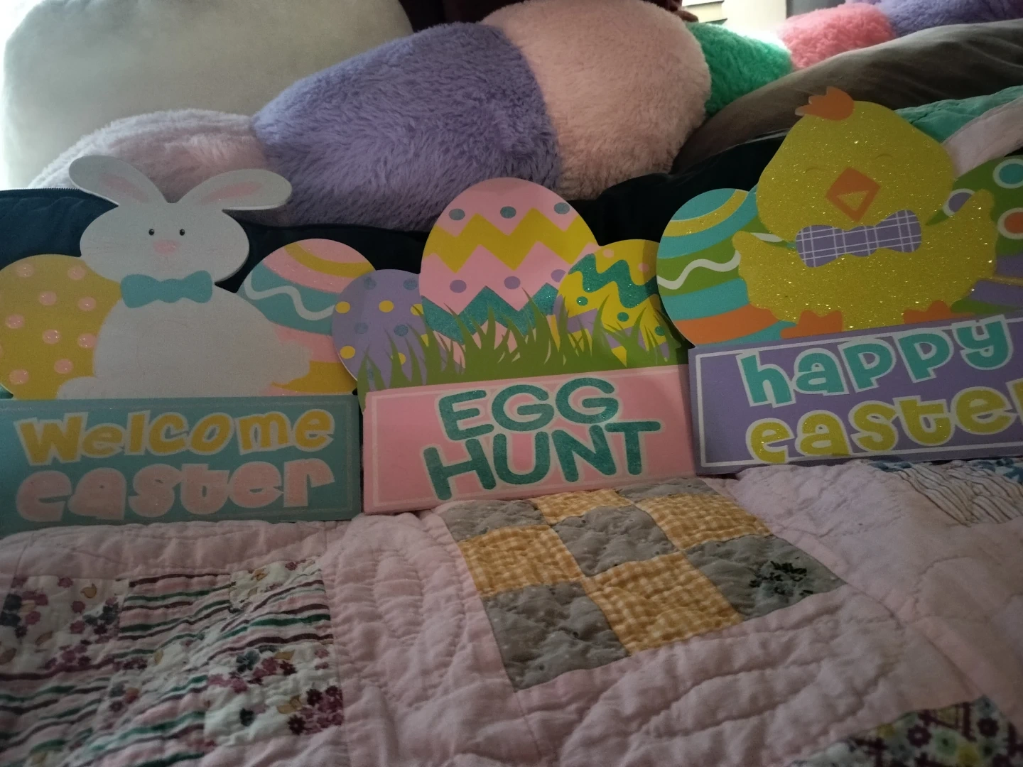 Set of three wooden Easter decorative signs for your home. Includes a 'Welcome Easter' sign with a bunny, an 'Egg Hunt' sign with colourful eggs and grass, and a 'Happy Easter' sign with a yellow chick. Perfect for seasonal decor!