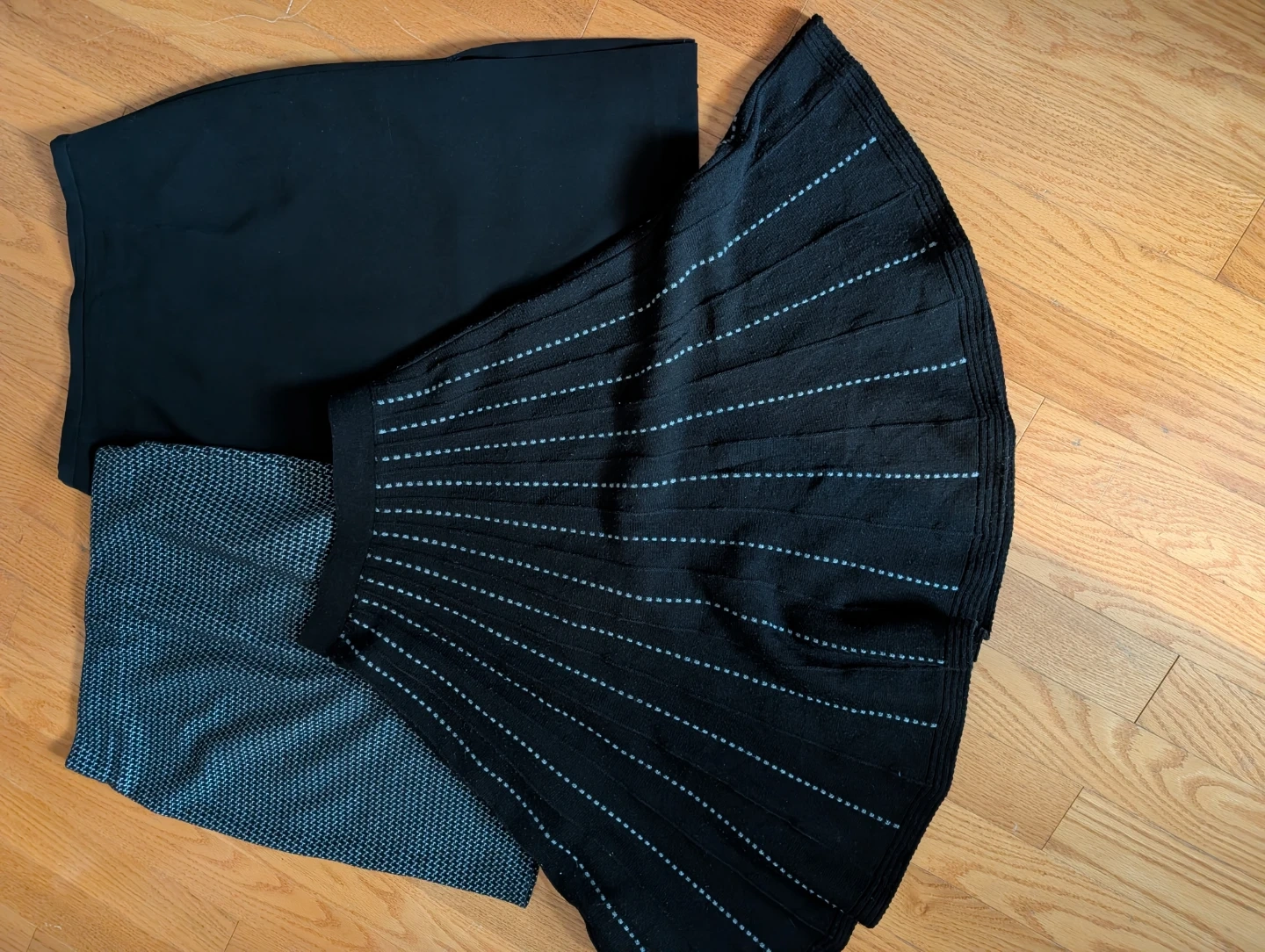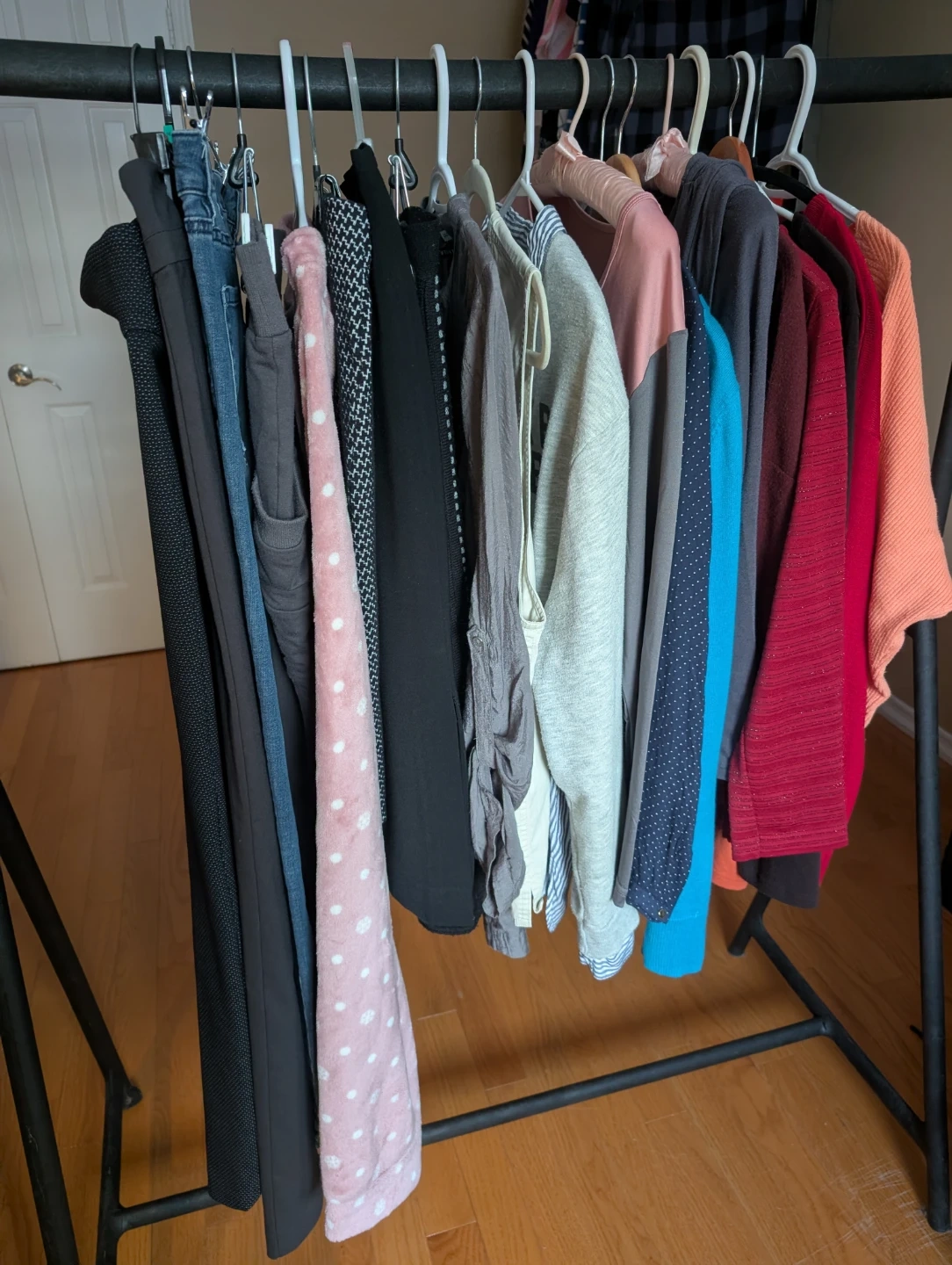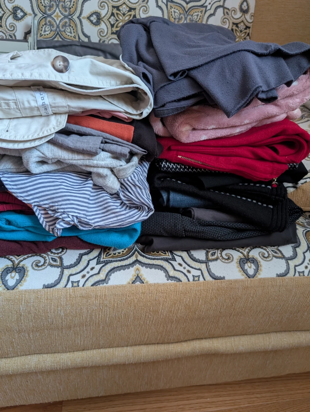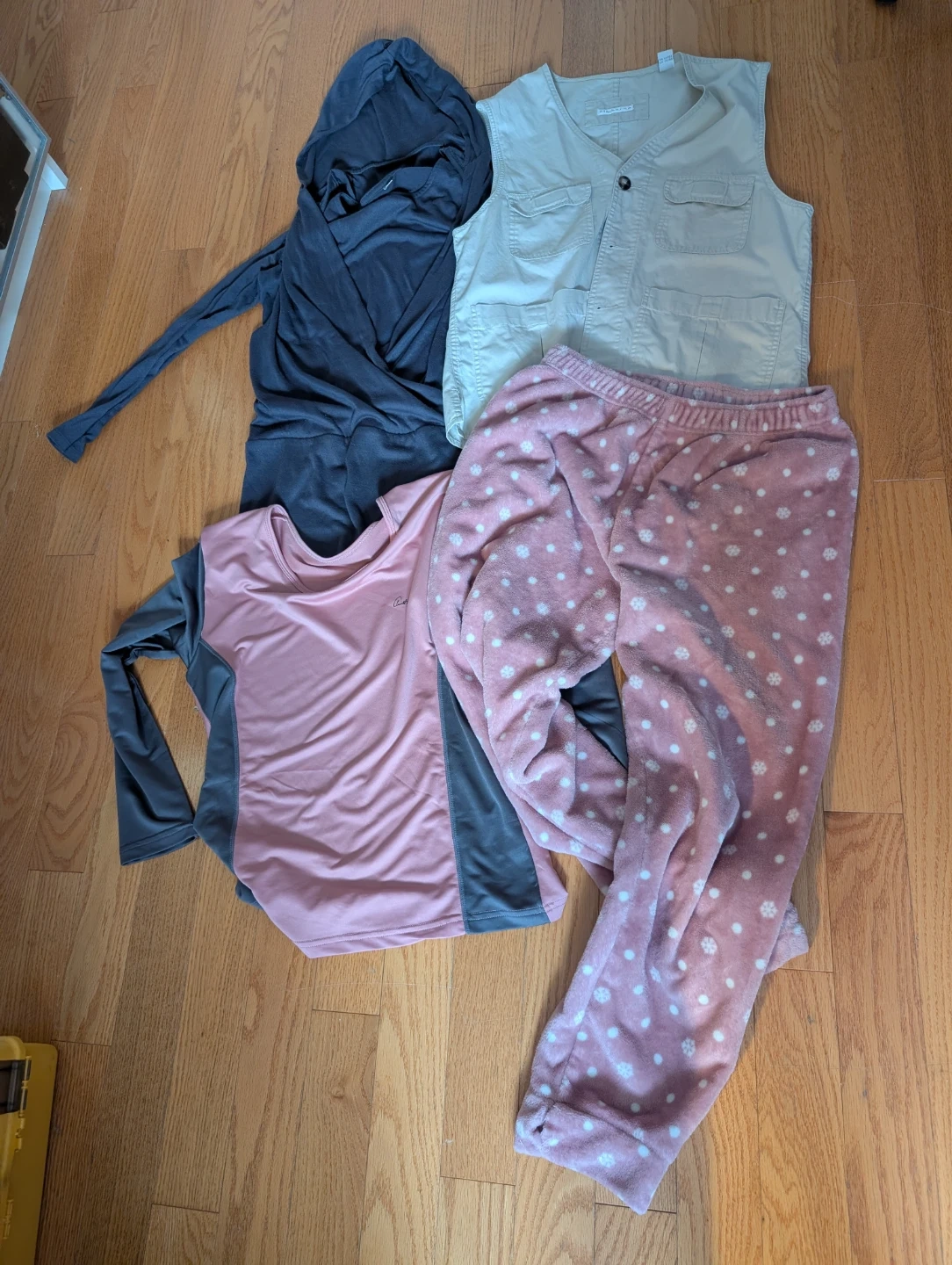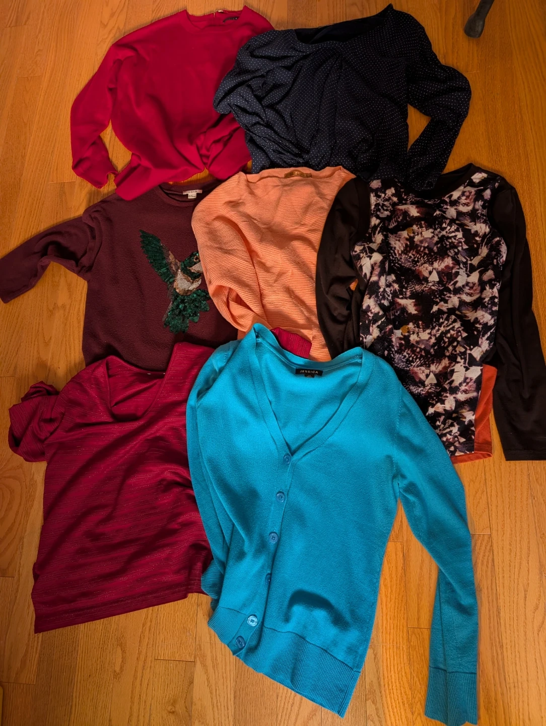 A bundle of assorted women's tops and bottoms. Includes sweaters, pants, skirts, blouses, pajamas. Various colours and styles. Size M. The price is for the whole bundle.