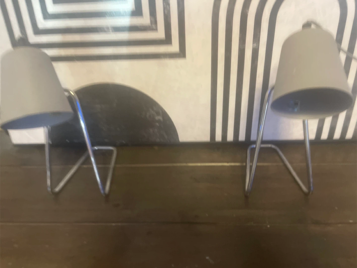 A pair of simple grey cone lamps with metal stands. These lamps are perfect for adding ambient lighting to a desk or bedside table. Each lamp is made with a metal base and a fabric shade.