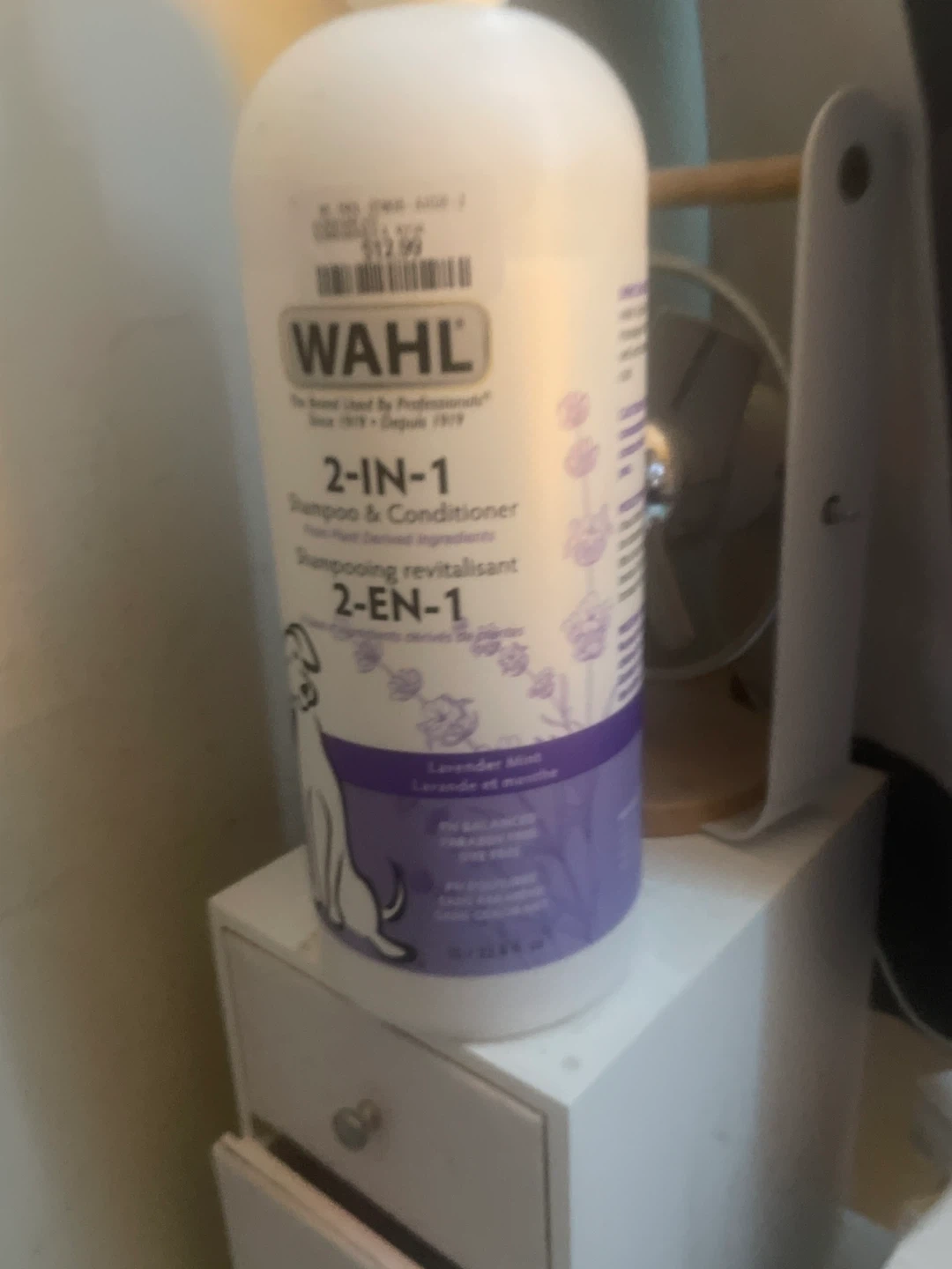 Wahl 2-in-1 shampoo and conditioner in a lavender mint scent. It's pH balanced and paraben free. This formula is for dogs. Use for bathing your pet!