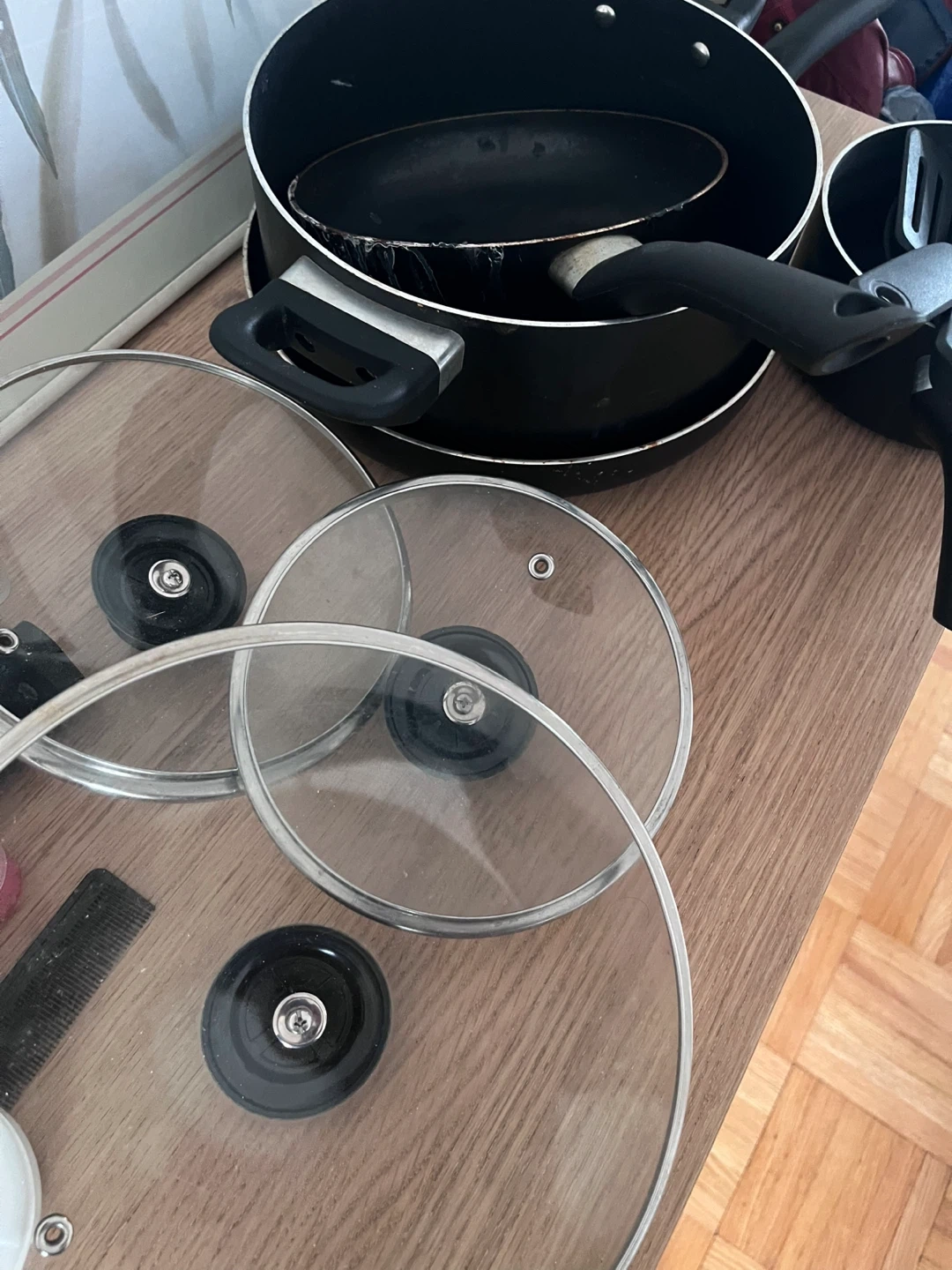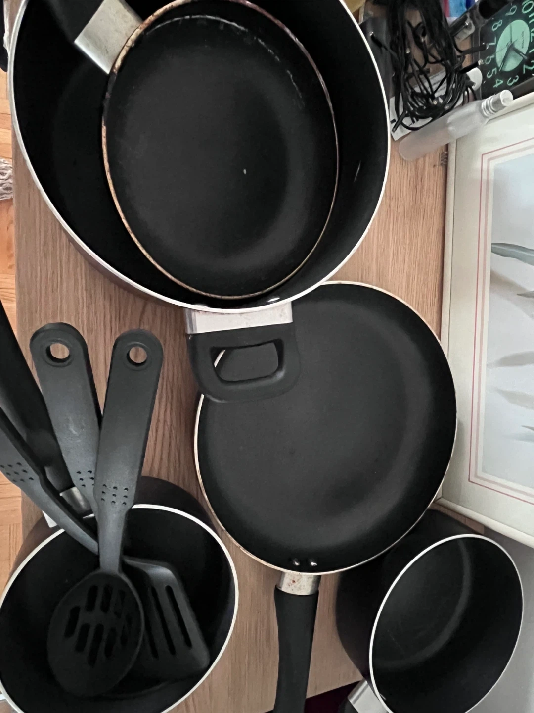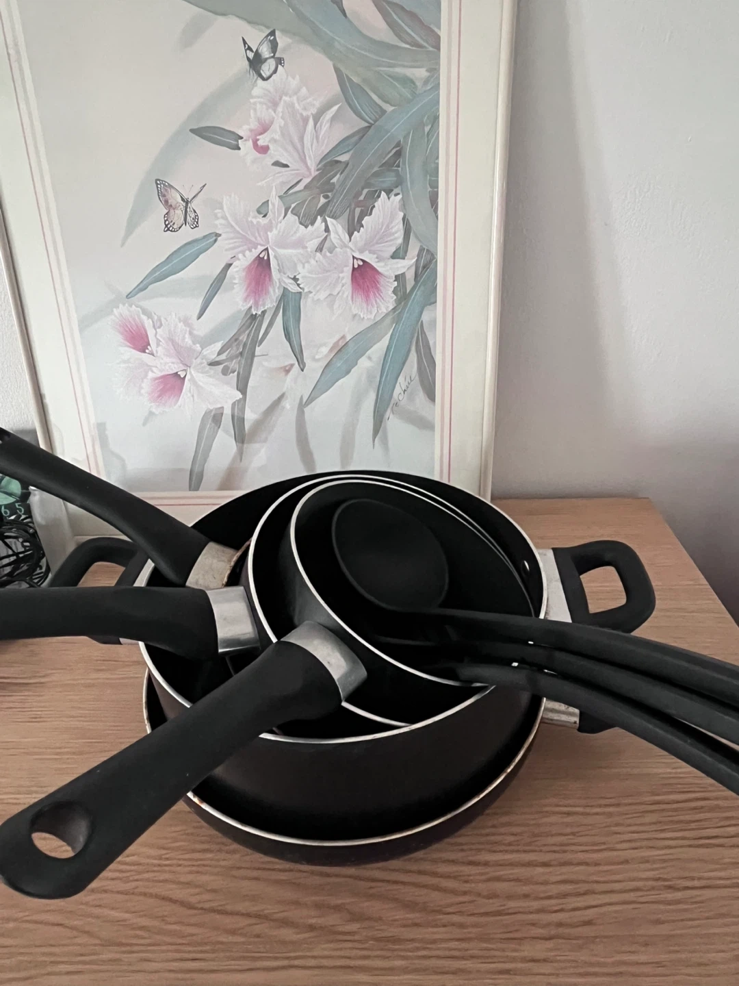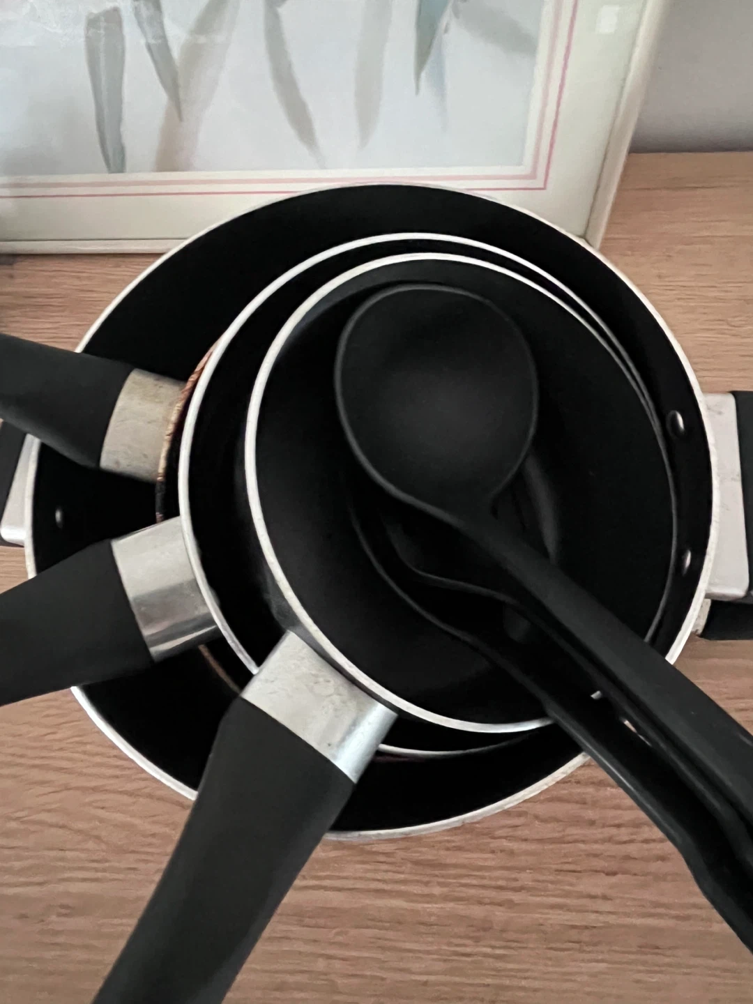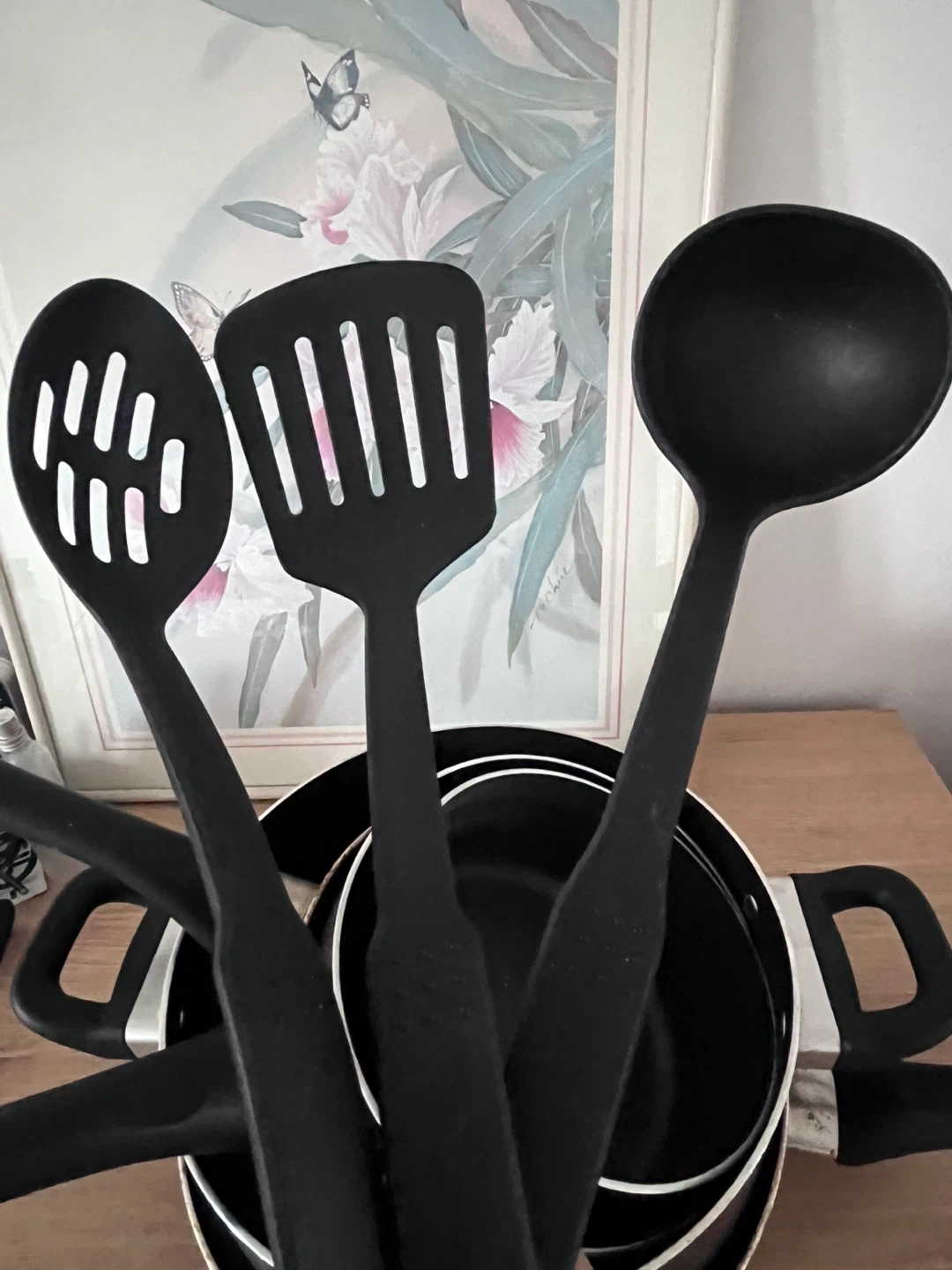 This is a 8-piece black cookware set. It includes pots, pans, and cooking utensils. Lids are also included. It's a great set for everyday cooking!